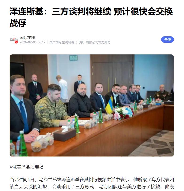 泽连斯基是真没招了?俄罗斯刚炸完乌克兰,他还得硬着头皮谈判 当地时间4日,泽连斯基发视频说,他听了乌方代表团的会谈汇报,这次是三方会谈,乌方还单独见了美方,聊了当天的进展,确定第二天继续谈,另外,估计用不了多久,俄乌就能交换战俘了。 他还说,乌克兰就一个想法,赶紧结束冲突,这得靠西方给实实在在的安全保障,再给俄罗斯施压。 很多人都会纳闷,俄罗斯都动手炸了,泽连斯基为啥不硬气点停了谈判、跟他硬刚? 其实不是泽连斯基软,是他真没招了,接着谈判,是乌克兰现在唯一的选择,咱们客观说说这事。 首先得说,这次谈判不是临时定的,早在今年1月23日,俄美乌就在阿联酋见过一次,这是冲突快四年以来,三方第一次坐一起谈正事,当时就说好后续接着聊,2月4日的会谈就是上次的延续。 而俄罗斯在会谈前一天,也就是2月3日,大规模袭击了乌克兰,炸得不少地方没电没暖气,老百姓日子更难了,但这次袭击不是要断了谈判,就是想在谈判桌上多占点主动。 泽连斯基就算被炸,也不停谈判,最核心的就是乌克兰撑不住了,根本没法跟俄罗斯硬打。 乌克兰的军队一直靠西方给武器、给钱,可现在西方不怎么帮了,德国给的援助少了一大半,美国也不直接给了,让乌克兰自己找第三方买,等于变相不帮了。 没了武器和钱,前线士兵弹药都不够,自己造武器的工厂也停了,经济也垮了,士兵工资、老百姓养老金都快发不出来了。 俄罗斯又炸了能源设施,老百姓冬天连暖气都没有,接着打,只会更惨,所以再生气也得谈,争取赶紧停火喘口气。 另外,西方也逼着泽连斯基接着谈。乌克兰一直靠西方撑腰,可现在西方自身都有难处,德国、法国经济不好,老百姓不愿意把钱拿来援乌,匈牙利总理直接说,泽连斯基要的援助就是坑欧洲。 而且西方还逼着泽连斯基让步,美国让他放弃顿巴斯,北约也施压,马克龙也准备跟普京对话,泽连斯基心里清楚,没了西方支持,乌克兰根本扛不住,只能听话接着谈,不然就被彻底抛弃了。 还有个实际原因,就是交换战俘。俄乌打了这么久,双方都有不少士兵被俘,他们的家人天天盼着亲人回家,这也是乌克兰老百姓最关心的事。 之前战俘交换停了好久,这次谈判有了点进展,要是因为俄罗斯袭击就停了谈判,战俘交换又得搁置,老百姓肯定反对泽连斯基,国内就更乱了,所以他只能耐着性子谈。 咱们也客观看看俄罗斯,它这次袭击,说是因为乌克兰先袭击了俄境内的民用目标,是正当反击。 俄罗斯的要求也简单,不让乌克兰加入北约、承认现在的领土情况,满足这些就能停火,战前袭击就是想逼泽连斯基多让步。 谈判是乌克兰现在唯一的出路,至于能不能谈成、能不能结束冲突,还不好说,但目前来看,接着谈判,就是最现实的选择。