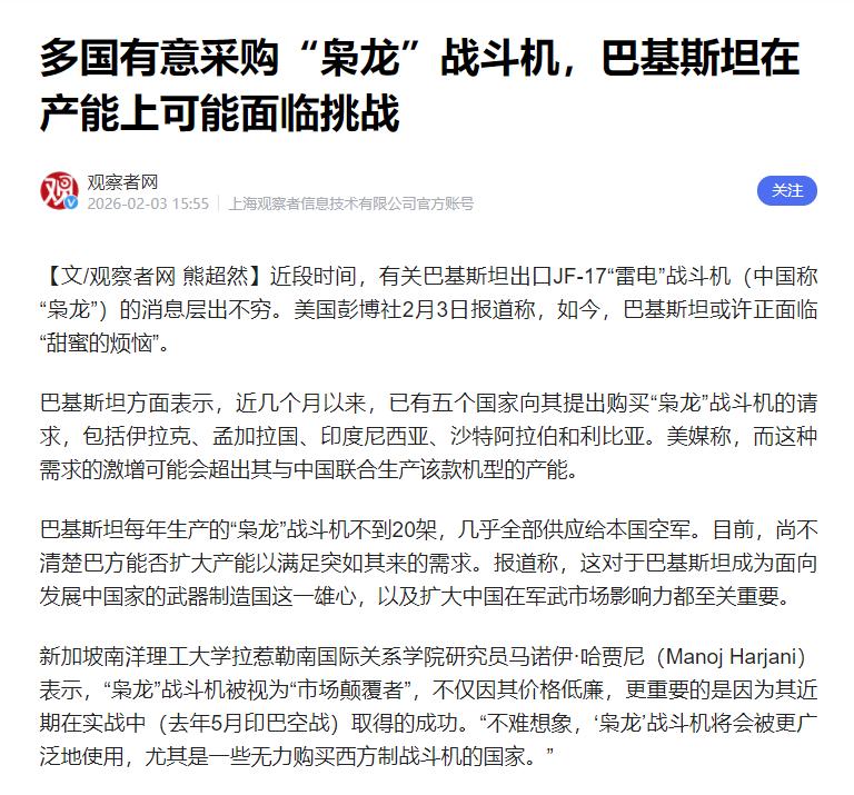 干得漂亮! 2月3号,巴基斯坦自己说,过去这几个月,已经有五个国家明确说了,想买这款枭龙战机,这五个国家分别是伊拉克、孟加拉国、印度尼西亚、沙特阿拉伯和利比亚。 这个消息一出来,咱们中国和巴基斯坦都挺高兴,这真是实实在在的“干得漂亮”。 但高兴归高兴,巴基斯坦也犯了愁,愁的不是订单多赚不完,而是现在生产速度跟不上,就算拼尽全力造,也难按时给这五个国家交货。 可能有人会问,这些国家为啥不买欧美、俄罗斯的战机,偏选枭龙?其实特别简单,就两点:好用、便宜,而且没有乱七八糟的附加条件,刚好合他们的心意。 这五个国家,大多是发展中国家,没那么多钱买贵的战机。就算沙特有钱,以前一直买欧美战机,现在也想多一个选择,而且枭龙确实划算。 像伊拉克、孟加拉国这些国家,军费不多,就想要性能够用、价格不贵,还能长期用的战机,枭龙正好符合。 枭龙是真的好用,它是咱们和巴基斯坦一起研制的,最新款的性能已经很先进,能在空中打仗,也能打击地面目标,还装了先进的雷达,看得远、能跟踪多个目标,日常保卫国土、应对小冲突,都完全够用。 更关键的是,它经过实战检验,之前印巴空战,枭龙还击落过印度战机,这让很多国家都放心买。 再说说价格,枭龙最新款一架也就2500万到5000万美元,而欧美同级别的战机,一架就要1亿多美元,买一架西方战机的钱,能买两三架枭龙,后续保养也便宜。 对这些预算有限的国家来说,买枭龙既提升了空军实力,又不花冤枉钱,肯定愿意选。 还有一点很重要,咱们卖枭龙不附加任何条件。以前很多国家买欧美战机,都会被要求不能和某个国家合作,甚至干涉人家的事。 但枭龙不一样,只要谈好价格,怎么用是人家自己的事,还会教他们的飞行员怎么开,提供零件,让他们买得放心、用得安心。 说完这些国家为啥买,再说说巴基斯坦的难处。他们高兴的是,枭龙被这么多国家认可,既能赚钱,还能提升自己的军工名气,但愁的是产能不够。 现在巴基斯坦每年只能造16到18架枭龙,而且大部分还要先给自己用,他们自己还有200多架老战机要换成枭龙。 现在已经确定要交的出口订单就有45架,加上这五个国家的意向订单,总共超过200架,按现在的速度,就算不停生产,也得做好几年才能交完货。 而且扩建生产线要很多钱,巴基斯坦经济不好,没钱快速扩建,部分核心零件还得靠俄罗斯和咱们中国提供,也需要协调。 不过大家不用愁,中巴已经在想办法了。巴基斯坦在扩建生产线,计划每年造30架以上,咱们中国也在帮忙,生产核心零件、保证供应,还优化了生产模式,尽量缩短交货时间。 总的来说,枭龙受欢迎,是咱们中国军工实力的体现,也是中巴合作的成果,虽然现在产能紧张,但慢慢都会解决,真的是干得漂亮!