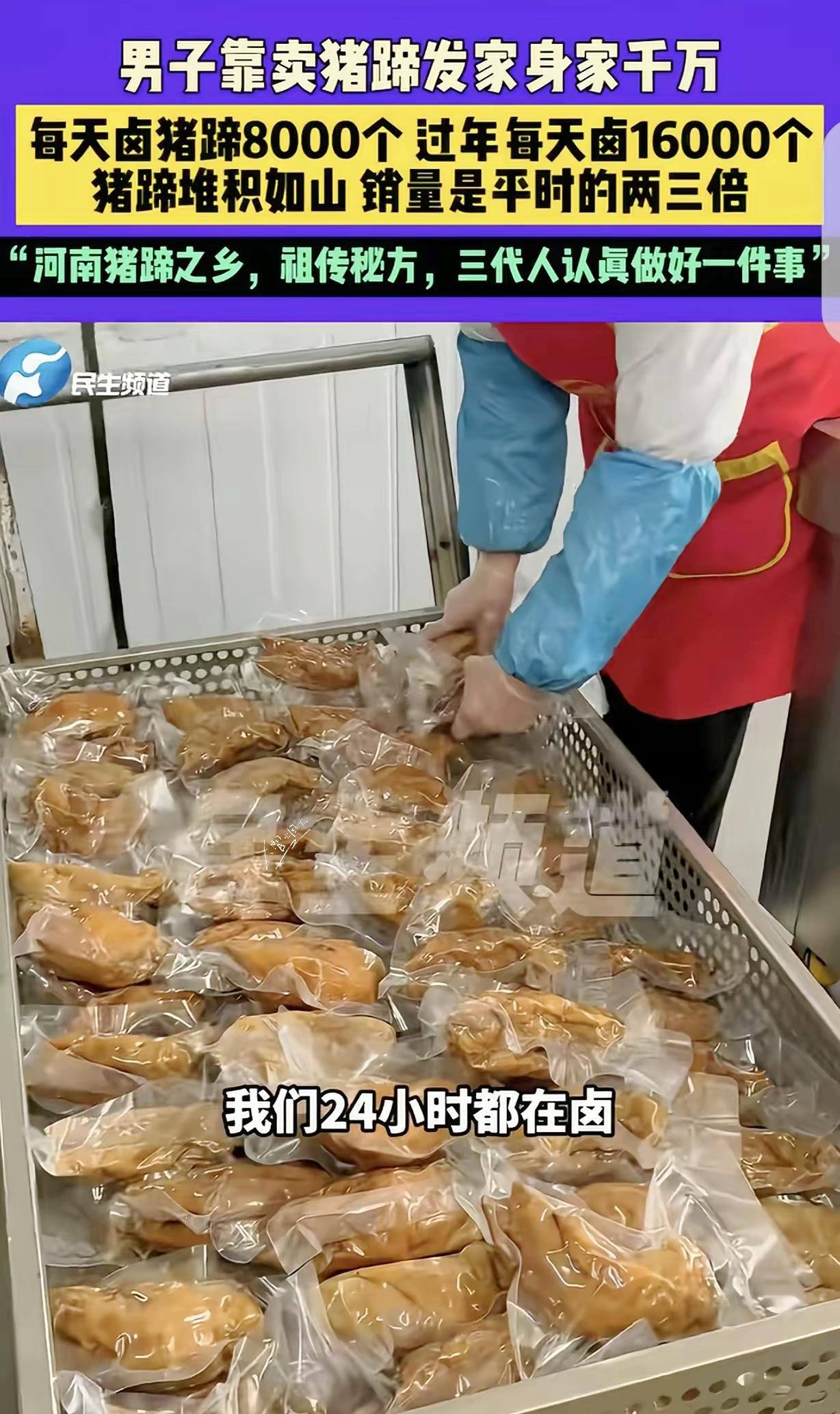 财不外露!”河南许昌,一男子靠卤猪蹄发家,身价千万,他说他家是祖传秘方,24小时都在卤猪蹄,平时一天卤8000个,过年要卤16000个,以前家里是3间破瓦房,如今厂子每年3千万-5千万很正常,店里每天都3-5万纯利润,他一家3代就做好一件事。网友:三五万纯利润,你缴多少税?都说秘方是祖传的、为啥以前还是破瓦房? 在河南许昌的街头,空气里弥漫着一股浓得化不开的卤料味。那口并不算太大的卤锅,此刻正像一台印钞机一样,咕嘟咕嘟地沸腾着。这就是张先生的战场。按照他的说法,这口锅24小时连轴转,根本不敢停。因为锅里翻滚的不仅仅是需要熬制12个小时的猪蹄,更是他口中“年产值5000万”的财富神话。 在这个故事里,数字是最刺激的肾上腺素。平日里一天卤8000个,到了今年1月这会儿,眼瞅着春节快到了,产量直接翻倍到了16000个。 张先生面对镜头时的底气,硬得像刚出冷库的冻肉。他毫不避讳地甩出账本:门店每天纯利润3万到5万元,工厂一年随随便便搞个三五千万。 听起来是不是很热血?一个住过三间破瓦房的穷小子,靠着“一家三代”的坚守,终于在卤汤里捞出了金山银山。但问题恰恰就出在这个太完美的“暴富剧本”上。当“财不外露”的古训被抛诸脑后,这场高调的炫富秀,很快就被路人手里的计算器敲得粉碎。 我们不妨来算一笔“漏洞百出”的账。如果是真的日进斗金,每天净赚5万,那一年就是近两千万的净利。这时候,网友的质疑就不仅仅是仇富了,而是带着税务稽查般的敏锐:“兄弟,这几千万的流水,税交够了吗?” 在如今的大数据税务系统面前,这种口嗨式的“晒账单”,无异于给自己发了一张税务局的“邀请函”。更有意思的是网友那套“法医式”的反向推导。有人较真地算过,如果按月销24万只猪蹄计算,假设那个“日赚5万”是吹牛,或者利润其实没那么高,那分摊到每只猪蹄上的赚头可能连两毛钱都不到。 这哪里是做生意,简直是在做慈善。这种“数据打架”的背后,藏着一个尴尬的逻辑硬伤:要么是利润惊人得需要补税,要么就是为了招商加盟,把牛皮吹到了天上。比账本更经不起推敲的,是那个贴着金字招牌的“祖传秘方”。 张先生信誓旦旦,说这是祖上三代传下来的手艺,用的是30多种名贵香料。可路人的眼睛是雪亮的。就在那条标榜“古法”的街面上,店铺门口堆得像小山一样的,却是印着外文的纸箱——澳大利亚冷冻猪蹄。 这就很魔幻了。你很难想象,张先生的祖辈在那个住破瓦房的年代,是如何跨越半个地球,搞定这些远洋而来的冷冻货源的。 如果“祖传”的仅仅是一锅汤,而食材全是现代工业流水线上的舶来品,那这个故事的底色,就从时间的沉淀变成了批发的廉价。 当整条街都挂着“祖传”的招牌,用的却是这一代才有的进口冻肉,“祖传”二字,也就成了同质化竞争中一块并不高明的遮羞布。 这种割裂感,最终还是报应在了食客的嘴里。所谓的“色泽红亮、胶原蛋白满满”,在滤镜碎裂后显得格外苍白。有冲着名气去的食客,买了真空包装的猪蹄回家,加热后却在肉皮上发现了不明的“白色颗粒状物体”。 那一刻,什么年入五千万,什么三代传承,都抵不过把这堆东西扔进垃圾桶时的恶心。为了春节前那16000只的疯狂产量,品控显然已经被抛到了脑后。在这个流量为王的时代,张先生或许真的赚到了钱。但那个关于“三间瓦房逆袭”的故事,越听越像是一场精心设计的流量泡沫。 真正的匠心,从来不需要靠“日赚五万”的数字来背书,也不需要靠“祖传”的名头来贴金。对于现在的张先生来说,与其在镜头前吹嘘那几千万的产值,不如先向消费者解释清楚,那锅卤汤里煮的,到底是祖宗的心血,还是澳大利亚的冰碴子。