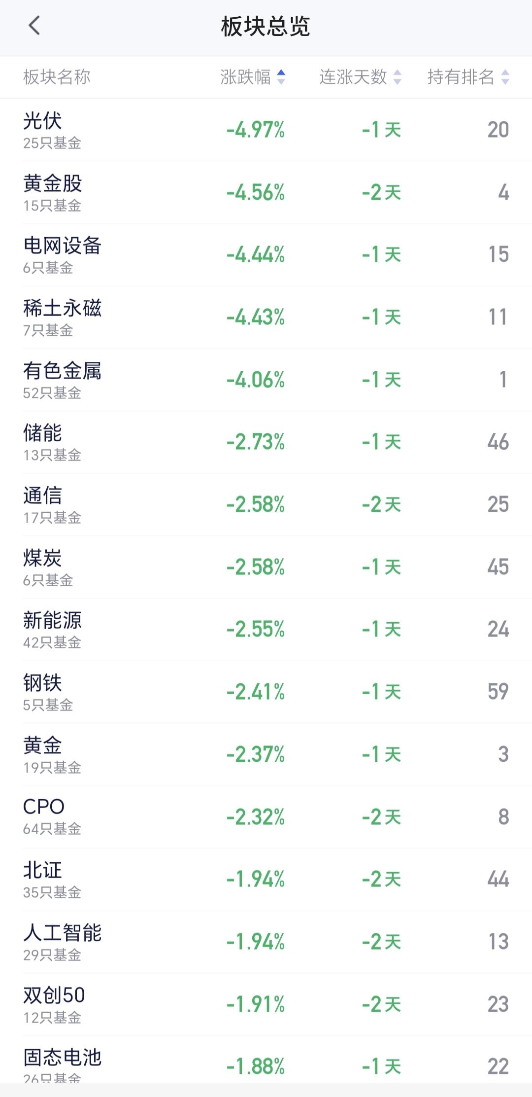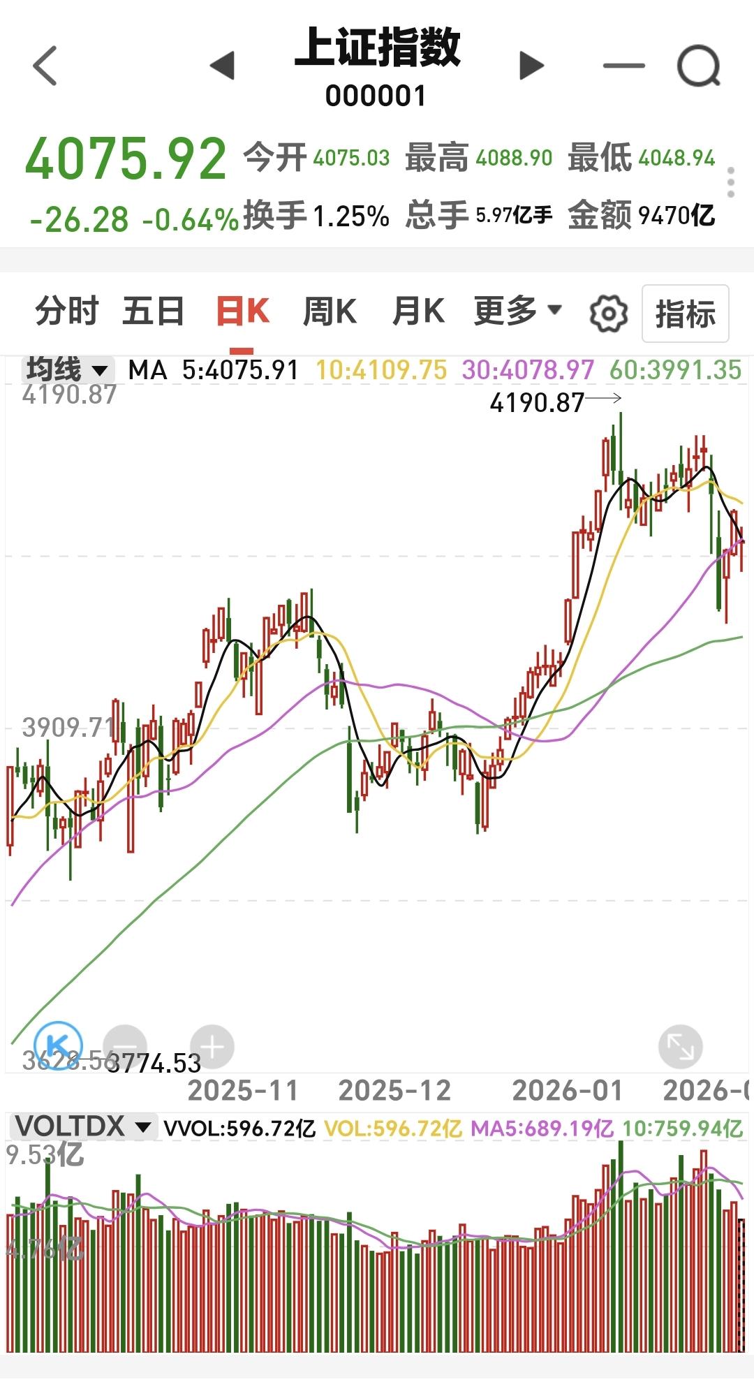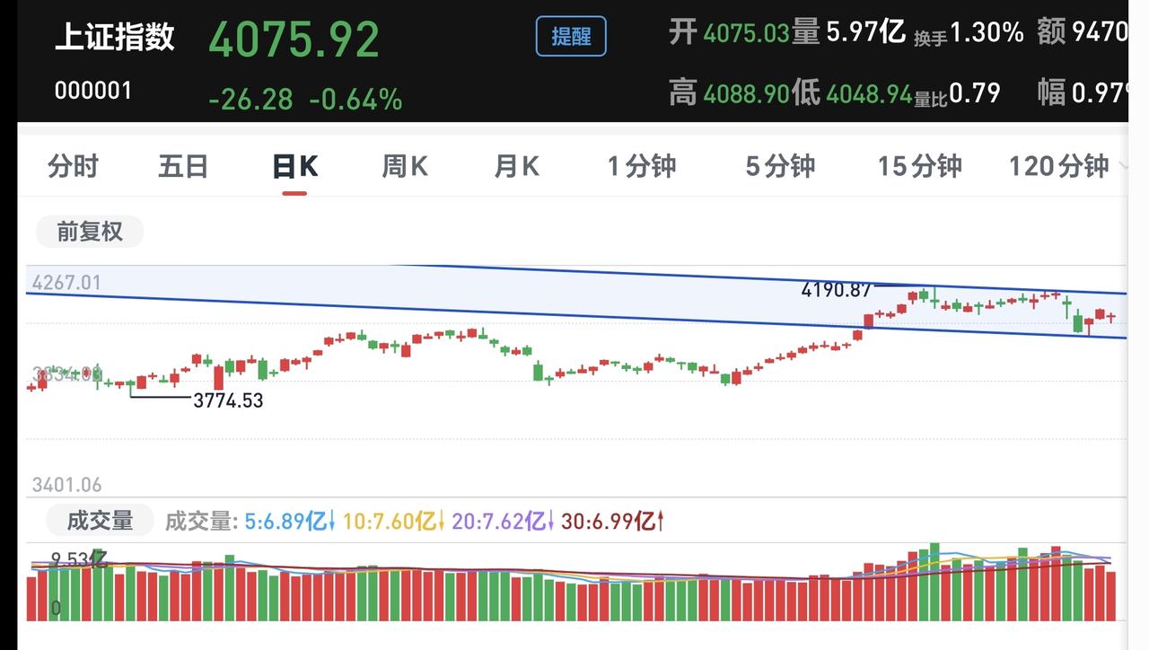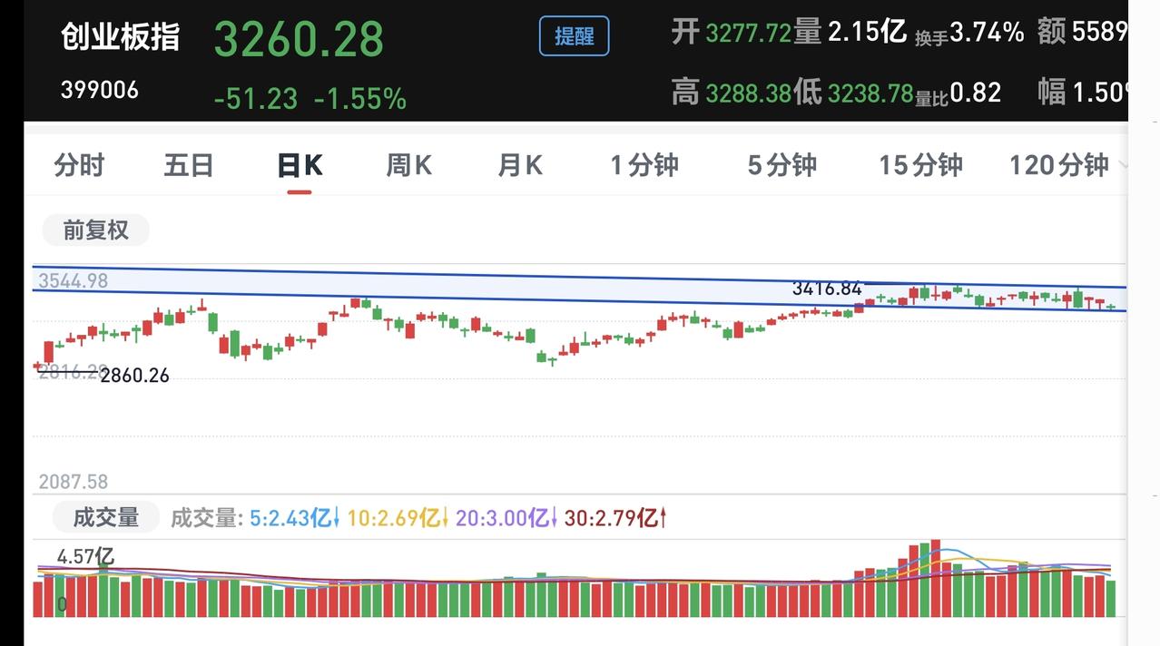 基金:什么时候才能看多做多 今天市场低开以后小幅度震荡,盘中最高4088点,盘中最低4048点,上下只有40个点的震荡幅度,收盘的时候三大指数都是下跌,创业板指下跌了1.55%,收于3260点,上证指数下跌了0.64%,收于4075点。 收盘的时候,五天线位置是4075.91点,收盘点位4075.92点,正好收在五天线上,但这不能说是有效站稳五天线,能不能站稳五天线,还需要明天继续观察。 市场上涨1600多家,下跌3700多家,涨停58家,跌停25家,两市累计成交21762亿,相比于昨天缩量了12%,主力资金净流出865亿,见下面的截图4。 今天上涨幅度最大的三个板块是:银行板块,消费板块,油气资源板块,下跌幅度最大的三个板块是:光伏板块,黄金板块,电网设备板块,见下面的截图5和6。 看下面的截图7,这是上证指数日K线图,现在的位置处于日线级别短期下跌通道中,近期观察能不能上涨突破这个下跌通道的上轨线,只有突破了这个上轨线才能看多做多。 看下面的截图8,这是创业板指日K线图,现在的位置也是处于日线级别短期下跌通道中,只有突破了这个下跌通道的上轨线,也才能看多做多。 持有的基金中,估值上涨幅度最大的三个板块是:大消费板块,证券板块,白酒板块,下跌幅度最大的三个板块是:新能源汽车板块,先进制造板块,5G板块,估值整体亏损了5801元。 我们最近就是盯住成交量,看看大资金是不是愿意进场,如果大资金不愿意进场,我们为什么进场,难道我们比大资金还要厉害,难道我们比大资金还要知道后面的走势。 花一秒钟点赞,花30秒钟评论,就是对我最大的支持,谢谢大家的支持。