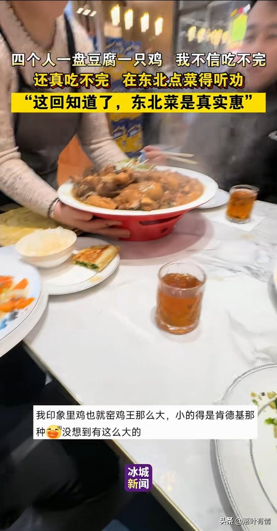 四个人去东北旅行,去一家餐馆点菜,只点了一盘豆腐和一盘儿大盘鸡! 他们还觉得不太够,有人建议等等再说,毕竟东北菜可是出了名的大! 有个男孩不同意,还想要再点,结果被劝下了,没等多久,一盘豆腐上来了!看着比自己脸盘子都大的豆腐,说点菜的男生彻底不吭气… 不一会服务员又把大盘鸡上上来了,结果又把他们惊呆了,这大盘鸡也太实在了,东北菜真的让人喜欢! 网友都表示到东北点菜一定要听劝,东北菜量真的不是其他地方可比的,这菜量实在太实惠了, 四个人两盘菜都吃不完,去东北吃饭的人太幸福了,论实惠还得是东北菜! 大家觉得东北菜是不是最实惠的? 大东北旅游 东北旅行必吃 东北三省的美食 东北游攻略 东北三省的旅游