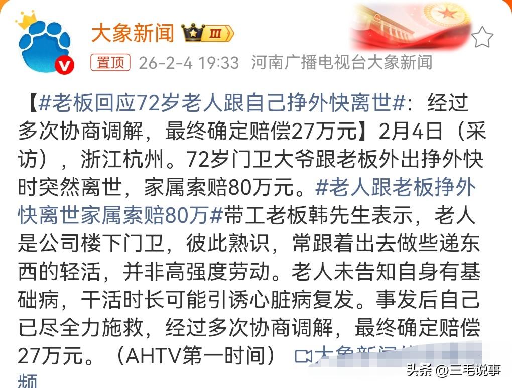 这老板心可真够大的。竟然用一个72岁的人帮自己做事。 要是出点意外就麻烦了,不出意外最终还是出意外了。 2月5日热搜报道这么一个事情,老人跟老板挣外快离世家属索赔80万。 这老人都72岁了,结果因基础疾病去世了。 家属索赔80万,老板喊冤说不知道他有基础疾病。 不过法律可不管你这么些,最终赔了27万。 这真是敲响了警钟啊。