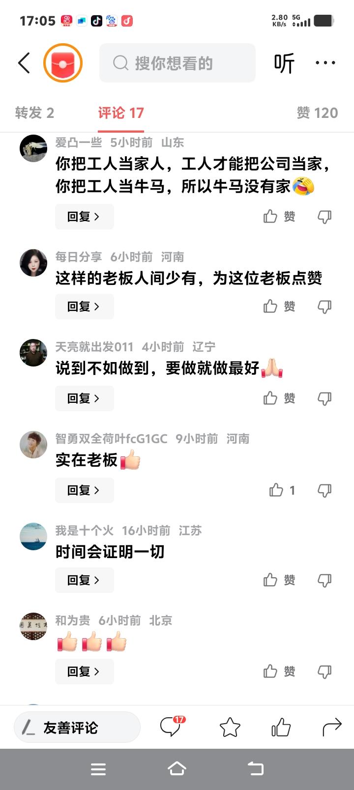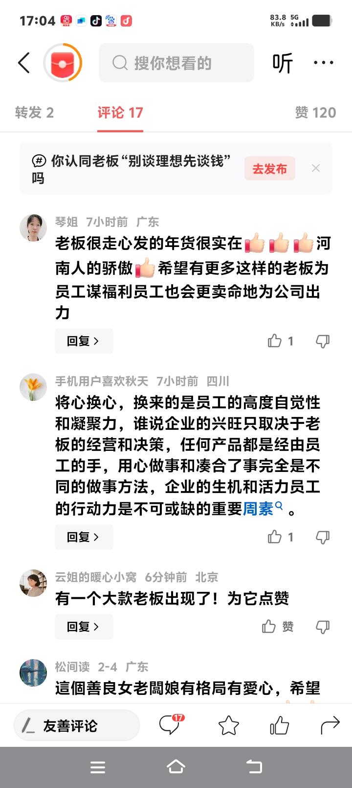 河南女老板豪掷300万发年货刷屏全网!一句“别跟我谈理想,先谈钱”撕碎多少企业遮羞布,员工抱猪肉抹泪现场震撼人心! 当别的公司还在用“年终总结PPT”当年会礼物时,河南这位女老板直接拉来半扇猪肉、整箱白酒和中华烟,堆成小山的年货背后是整整三百万真金白银。现场视频里,有的男员工咬着牙不让眼泪掉下来,有的女工抱着沉甸甸的年货袋子手都在抖。 这年头,老板们总爱把“团队是家人”挂在嘴边,可一到发福利时就突然“家境困难”。行业寒冬里裁员降薪的消息不绝于耳,这位女老板却逆流而上:全员涨薪,再自掏腰包给两百多员工办实打实的年货。有人说这是土味营销,但员工手里攥着的钞票不会说谎。 质疑声来得比掌声更快。“作秀”“摆拍”“明年就该裁员了”的评论瞬间涌来。直到女老板对着镜头甩出一句:“所有能做大生意的老板都明白,别给员工谈什么狗屁理想,就一个字——钱!”这话像一颗炸雷,把职场里那些精致的话术炸得粉碎。 我们见过太多魔幻场景:老板开着新提的保时捷,却对员工说“今年公司困难年终奖取消”;HR把加班说成“成长机会”,把底薪低美化成“给你发展空间”。当生存都成问题,谁还能仰望星空?女老板的大实话,恰恰戳穿了这套皇帝的新衣。 有网友翻出胖东来的案例:清洁工月薪近八千,商场地板亮得能照镜子。为什么?因为员工知道公司好自己才会好。将心比心从来不是句空话,当你把员工当合伙人,他们才会把公司当战场;当你只把员工当成本,他们自然只会把工作当负担。 当然也有人忧心忡忡:“这会不会带坏风气?人都只看钱怎么办?”但说这话的人可能忘了,马斯洛需求金字塔的底端永远是生存。当员工为孩子学费发愁时,你和他谈企业文化;当父母看病缺钱时,你和他谈社会责任——这不是崇高,这是何不食肉糜。 那位抱着猪肉落泪的员工,可能正在盘算着今年终于能过个肥年;那个攥着红包的小伙子,或许在想终于能给媳妇买件像样大衣。职场人的尊严,有时候就是一桶油、一条烟、一沓能实实在在揣进兜里的钞票堆起来的。 这场发生在河南某县城的年终狂欢,像一面镜子照出中国职场的两个极端:一边是用情怀当廉价劳动力的聪明人,一边是把真金白银拍在桌上的“傻子”。而时间终将证明,哪些企业能留住人心,哪些企业只能在员工离职时才想起“我们都是家人”。 (来源:根据河南商报及多家自媒体现场报道综合整理) 职场真相 老板格局