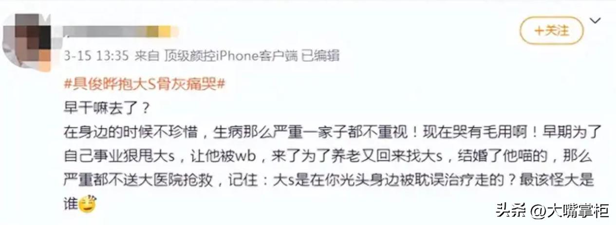 我不能为了爱情放弃事业,这是具俊晔当年主动和大S分手的理由。 最近,具俊晔在大S忌日穿的那件咖色大衣,引起了大家关注。 具俊晔说,这件大衣是大S 26年前送给他的,他一直珍藏着没有扔,大S去世这一年,具俊晔瘦了许多,这件大衣现在穿着特别合身。 即便过20多年,这件大衣看起来依然价值不菲,而且也不觉得过时了,大S眼光真的不错。 有点不明白的是,当年具俊晔主动提分手,在媒体面前否认这段关系,称大S为“那个人”,并且爽约不上大S的节目,让大S被大家笑话被人甩,如此种种,他不应该在提分手时,把曾经接受的贵重礼物还给大S吗? 把人家甩了却不归还礼物,而且还一直保留着这件衣服,这是什么神仙操作啊,难道他知道有一天还会和大S重逢?如果这样解读,具俊晔真的很深情,也很喜欢保留旧物。