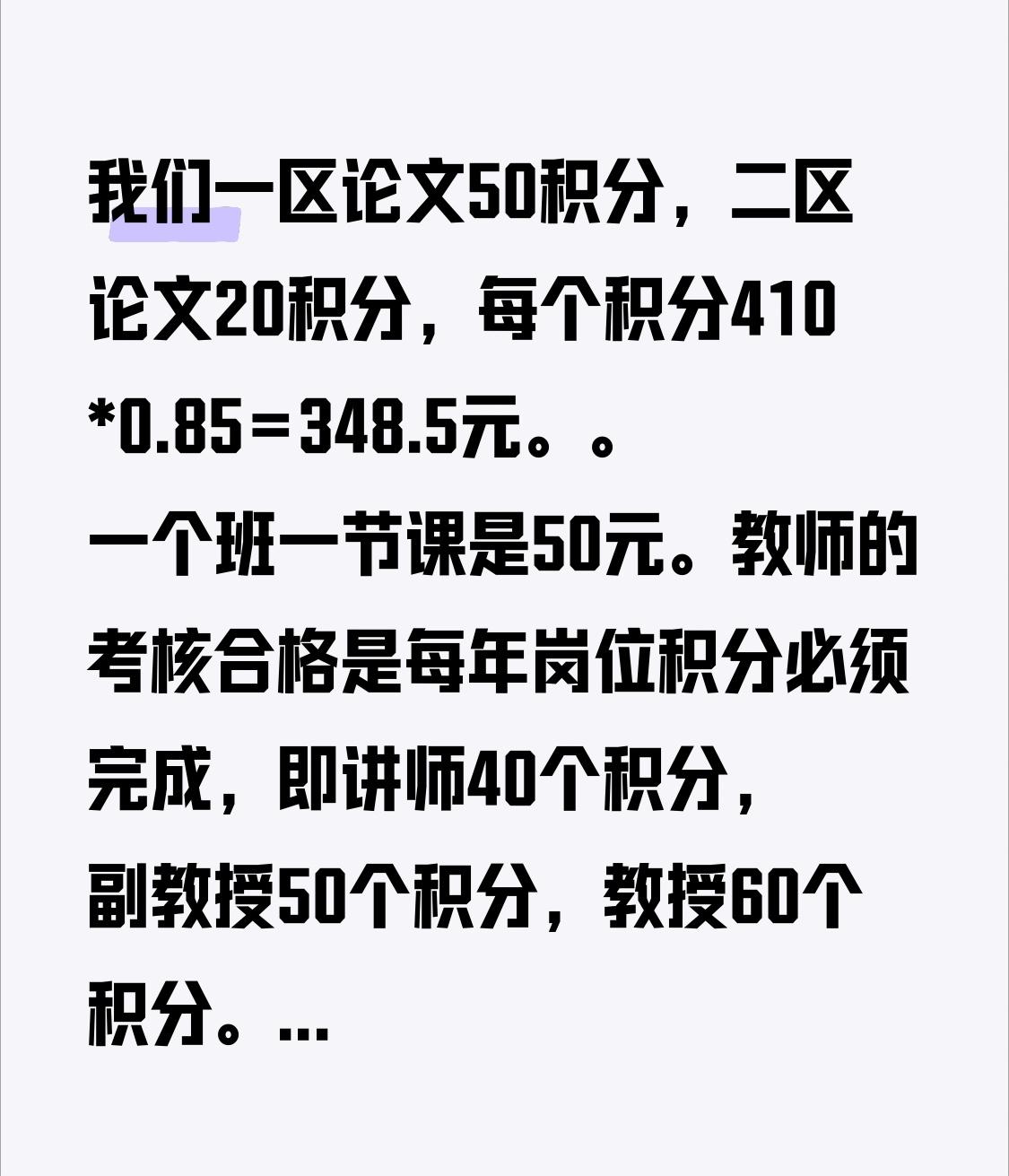 今年我们学院行政人员,包括辅导员,绩效是6.5万。教师是3000-6000。。太魔幻了!! 也就是教师在完成岗位积分的前提下,比如四级岗要求60个积分,要另外发2篇一区+3篇二区论文的奖励,才能赶上院办那些秘书的绩效,哈哈。。哦哦,发论文还要版面费,实验费我就不提了!! 去年行政是7万,教师是2.5万!! 我们一区论文50积分,二区论文20积分,每个积分410*0.85=348.5元。。一个班一节课是0.1个积分,50元。。一个专业40多个老师,每个分到的课很少!!行业萎缩,项目也很少!! 教师的考核合格是每年岗位积分必须完成,即讲师40个积分,副教授50个积分,教授60个积分。。。或者完成80%积分+15万项目经费,或者完成60%积分+25万项目经费。。压力很大!! 教师考核 高校绩效 高校教师绩效 教师绩效管理