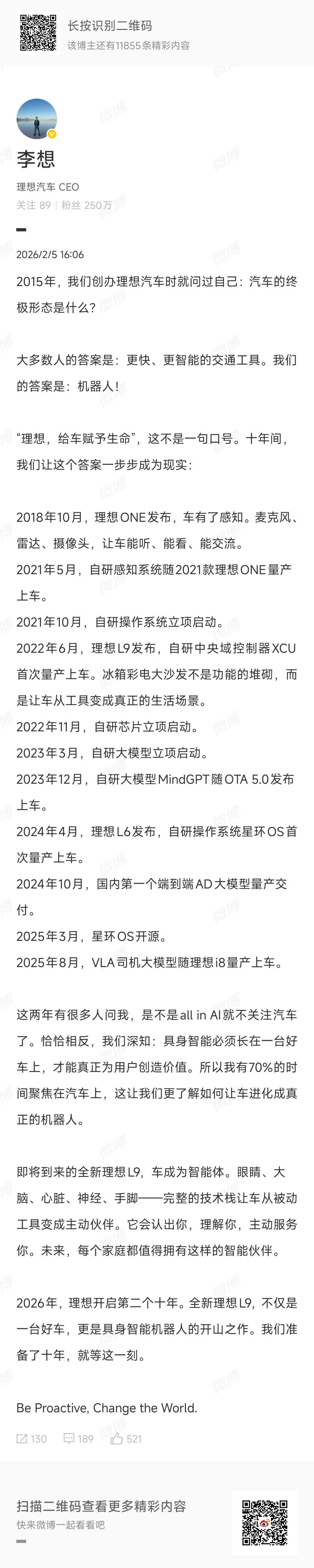 李想官宣全新理想L9,正式开启预热「全新理想L9不仅是一台好车,更是具身智能机器