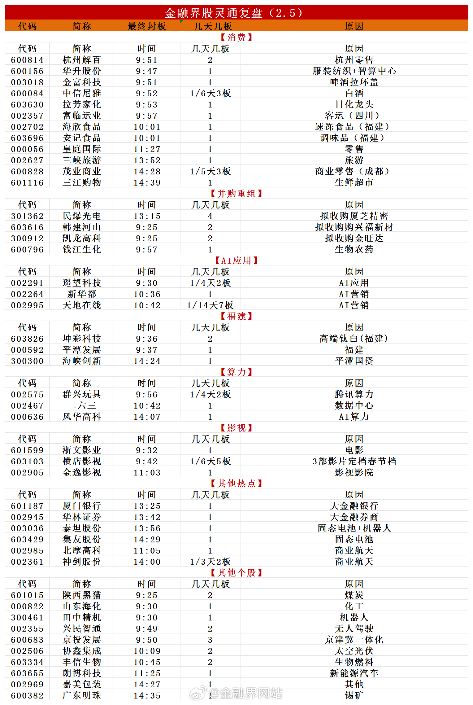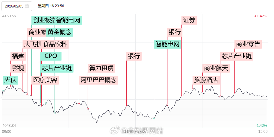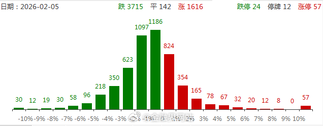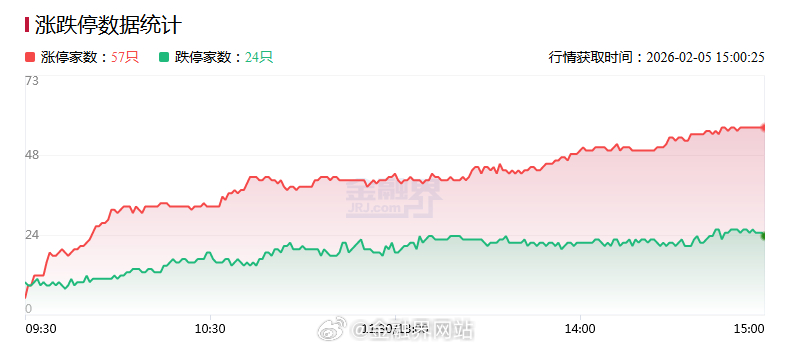 【涨停复盘:今日全市场共57只股涨停,连板股总数10只,大消费板块爆发,横店影视、安记食品涨停!】 2月5日,三大指数午后跌幅收窄,收盘沪指跌0.64%、深成指跌1.44%、创业板指跌1.55%,沪深两市成交额2.18万亿(缩量3048亿)。全市场超3700只个股下跌,不含ST、退市股共44股涨停,连板股10只,封板率81%;焦点股有天地在线14天7板、横店影视6天5板、民爆光电20CM4连板。板块上,大消费、大金融、商业航天、算力租赁等活跃,有色金属、电网设备等跌幅居前。相关热点:AI+零售千问启动30亿春节计划;福建将恢复上海居民赴金门马祖旅游;2026年1月A股新开户491.58万户(环比增89%、同比增213%);中国电信展示量子科技三大赛道成果。详情:涨停复盘:今日全市场共57只股涨停,连板股总数10只,大消费板块爆发,横店影视、安记食品涨停!