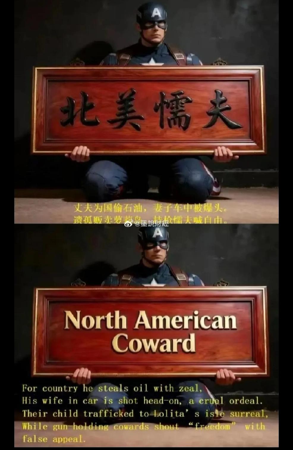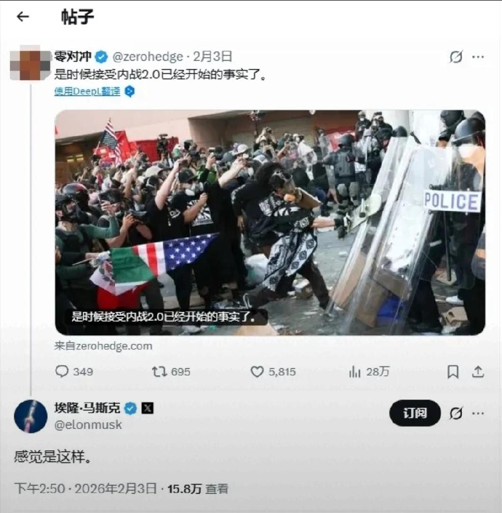 日前,马斯克在社交媒体上评价一条“是时候接受第二次美国内战已经开始的事实了”写到“感觉是这样”表明马斯克也认同美国新一轮内战已经开始的事实。 不由得想起另一则中文媒体上的资讯: 横批:北美懦夫 丈夫为国偷石油,妻子车中被爆头。遗孤贩卖萝莉岛,持枪懦夫喊自由。 个人认为:中国有句话:“忍无可忍时,便无需再忍”。 送给美国革命老区的战友们,请相信中国无数的先辈验证的道理:“枪杆子里出政权。星星之火,可以燎原。” 真心希望美国人民可以醒悟。