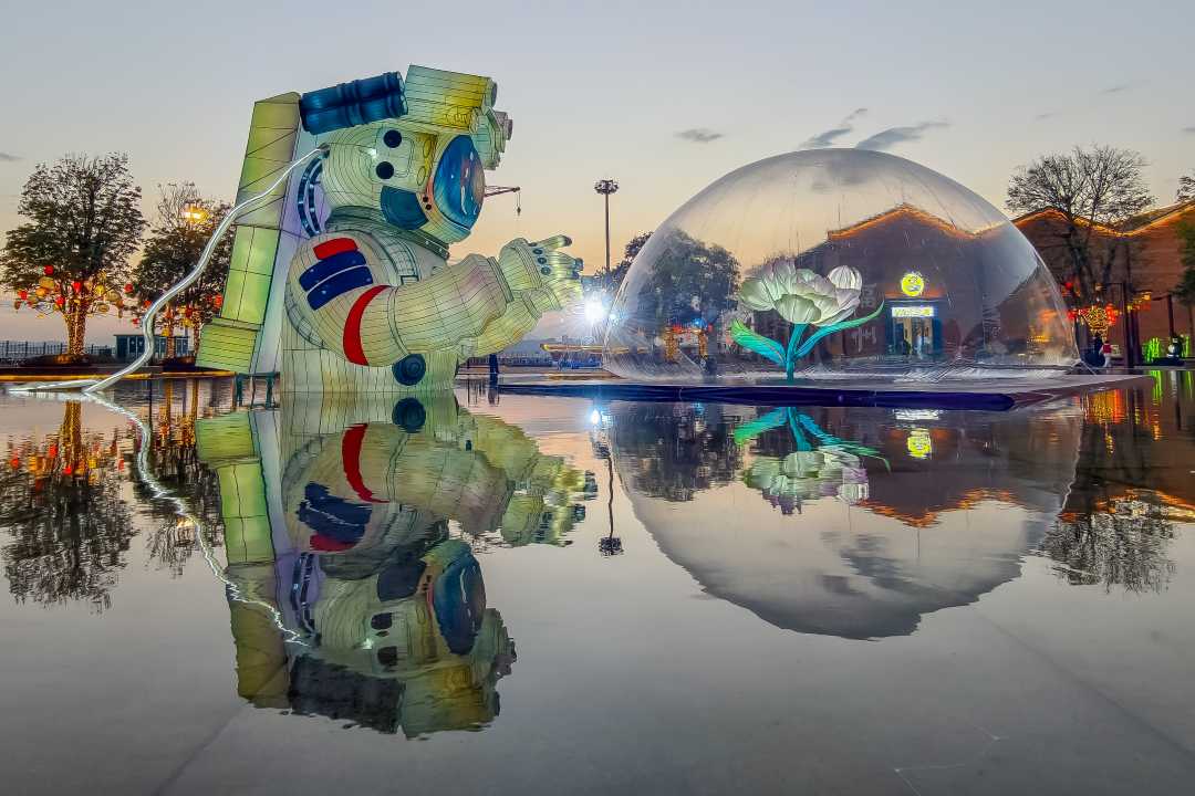 2月4日,福建省福州市中国船政文化园,第二十四届“两马同春闹元宵”灯会正式亮灯启幕,“月海望宇”灯组吸引市民驻足欣赏。