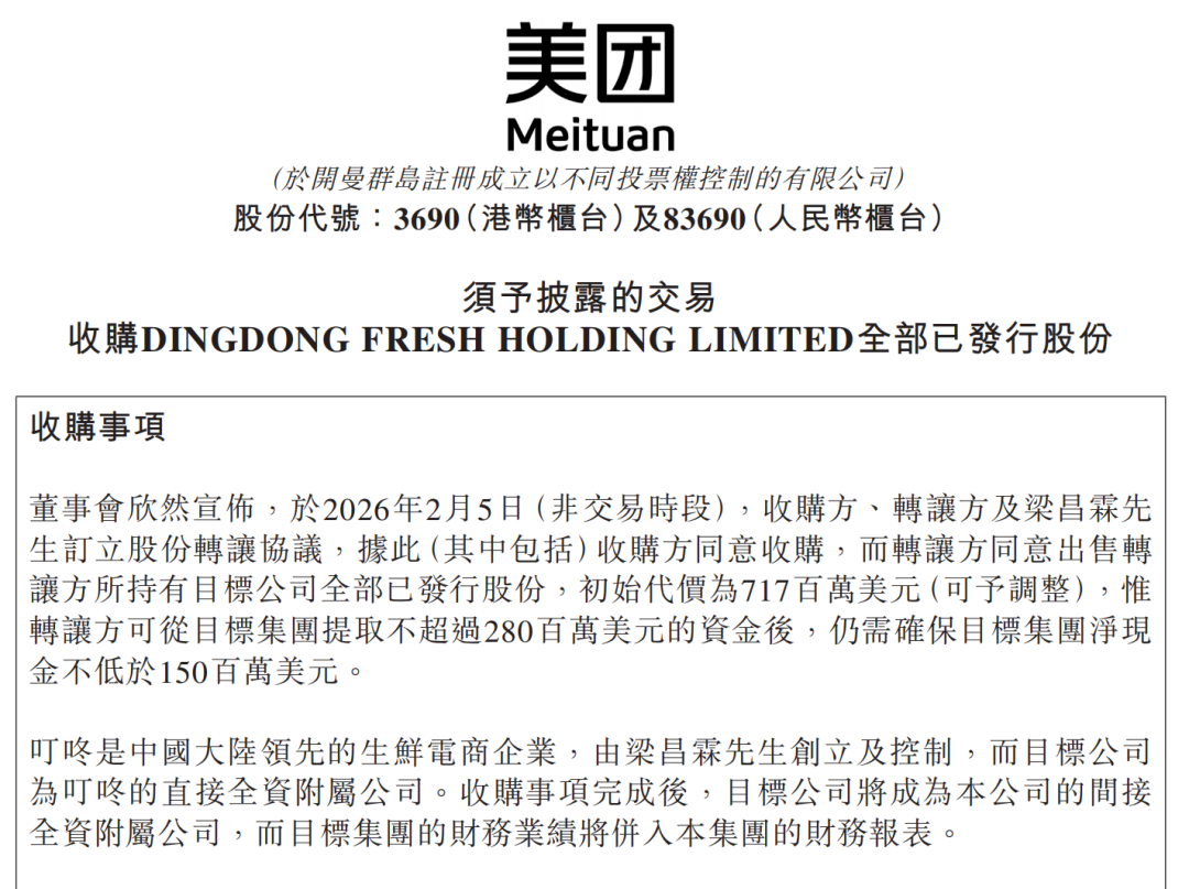2月5日盘后,美团在香港联交所发布公告,将以约7.17亿美元的初始对价,完成对叮咚买菜中国业务100%股权的收购。此次收购将使叮咚成为美团的间接全资附属公司,其财务业绩将并入美团的财务报表。
