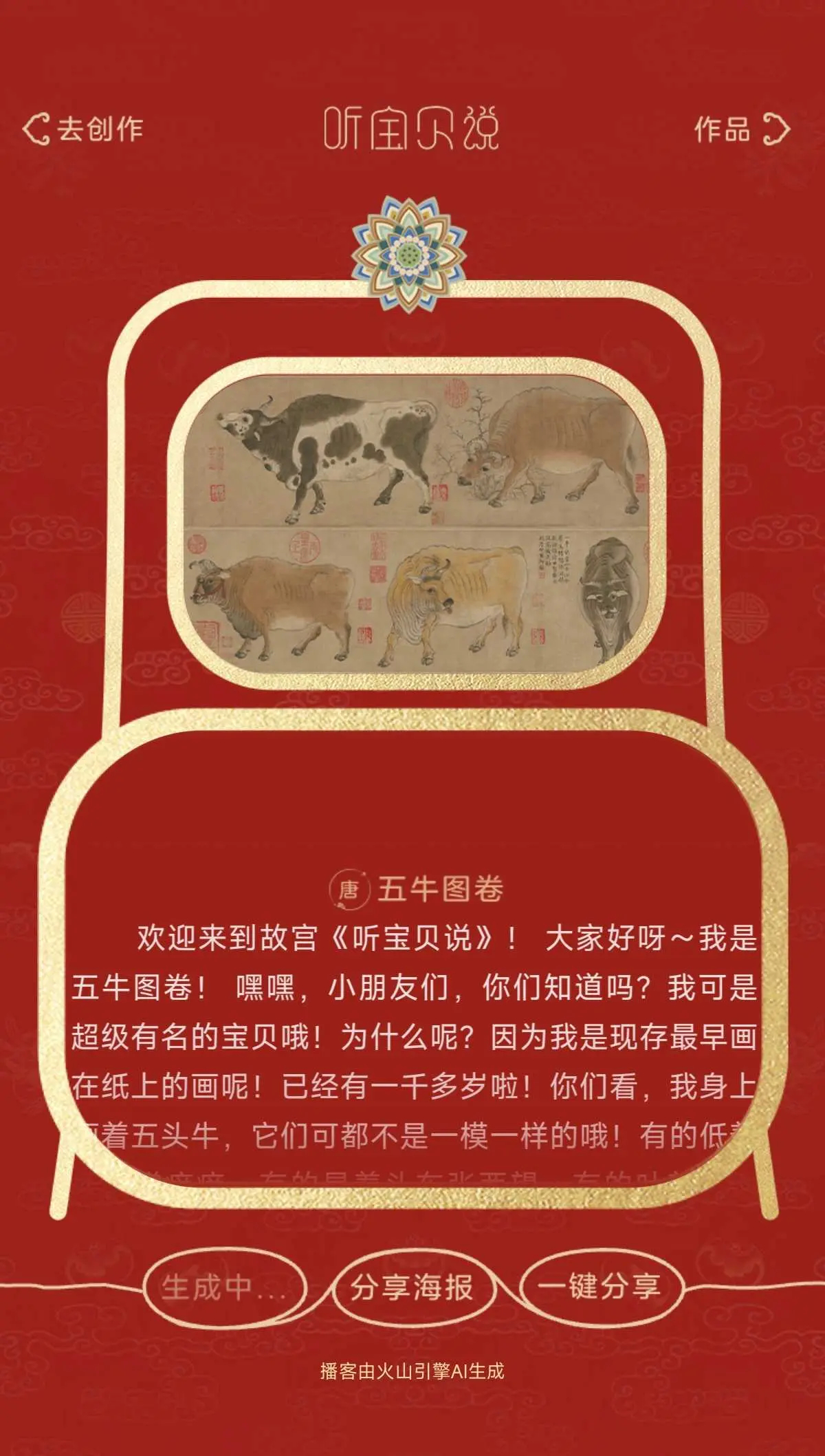 "我娃居然主动给我上了一堂文物课自从玩了「听宝贝说」,我家“小话痨”找到了新舞台!他现在热衷于扮演“小老师”,拉着我非要给我讲“五牛图卷”。这个播客不仅仅是灌输知识,而是通过角色扮演和开放式提问,激发孩子的表达欲。我儿子会模仿播客里的语气提问,然后把他刚听到的知识,磕磕绊绊但又充满热情地讲给我听。这种从“被动听”到“主动讲”的转变,对建立自信和加深记忆太有帮助了。亲子互动终于不是只有读绘本一种方式了,一起探索历史,还能互相当学生,趣味性满分!"
