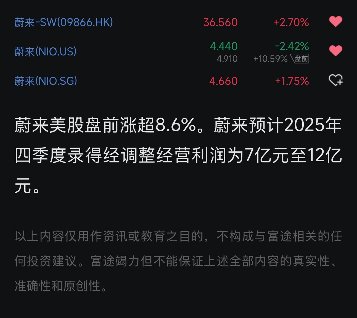 蔚来Q4 预计盈利7-12个亿!盘前10cm咯