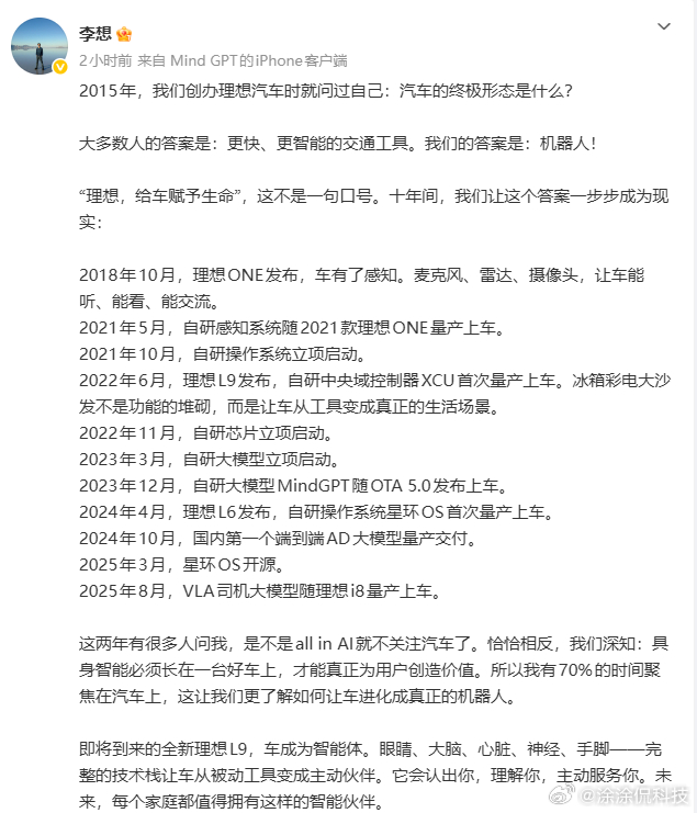 大家期待的理想全新L9就快来了,这次定位很有趣,李想的意思是车会成为智能体,从过去的被动工具化身为主动伙伴,理解并且主动服务好用户。虽然不清楚具体的功能是什么,但很明显是借助于AI发力,可以期待下,毕竟是理想开启第二个十年的关键车型。李想官宣新L9即将到来