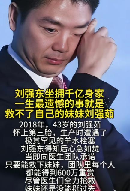 刘强东唯一一次在公众面前流泪,是谈到他妹妹。当年,他的妹妹曾因高龄生子,突发疾病去世。刘强东悲痛欲绝,从那时起,每年给妹夫打100万,负责3个外甥女的费用。 在宿迁来龙镇光明村,刘强东的豪华别墅对面就是村委会大楼,每年春节这里都会堆满他送给乡亲们的年货。 但2018年之后,这个场景总让人想起一个永远缺席的身影。他的亲妹妹刘强茹。 这个曾在宿迁中学教英语的女子,在43岁那年因羊水栓塞去世,留下了三个未成年的女儿和一段关于亲情与选择的沉思。 刘强茹比哥哥小一岁,童年时父母常年在外面跑船,兄妹俩成了最早的“留守儿童”。 村里还没通电的年代,夜晚总是漆黑一片,年幼的刘强东会关紧门窗,守着妹妹先睡着,自己才敢合眼。 有调皮男孩欺负妹妹时,他总是第一个冲出去保护,这种相依为命的童年,塑造了兄妹间特殊的情感纽带。 大学毕业后,兄妹俩走上了不同的人生道路。 刘强东在北京创立京东,而刘强茹选择回到家乡成为一名中学英语教师。 她曾在论文中写道:不是每个学习不好的学生都是因为智力因素,提倡因材施教的教育理念。 这份对教育的热忱,让她在家乡找到了属于自己的成就感。 婚姻生活方面,刘强茹经历了起伏,第一段婚姻结束后,她独自抚养女儿。 直到遇到同为教师的第二任丈夫,生活才重新找到平衡。 这位丈夫不仅对她体贴入微,对继女也视如己出,甚至会主动送继女去探望亲生父亲。 这种平凡而真挚的幸福,成为了她生命中最安稳的依靠。 2018年初,43岁的刘强茹发现自己再次怀孕,尽管哥哥刘强东担忧她的身体状况,但她还是决定留下这个孩子。 这年11月9日,在宿迁市第一人民医院,孩子平安降生,但刘强茹却因羊水栓塞抢救无效去世。 羊水栓塞被称为“产科医生最怕遇见的极度凶险难题”,从发病到死亡可能只需要几分钟到两小时。 即使是在医疗条件不断进步的今天,这种并发症仍然无法预测和预防。 妹妹的离世对刘强东造成了深刻影响。 据说,他从此承担起照顾三个外甥女的责任,并资助她们的生活和教育费用。 而刘强茹的丈夫则选择独自抚养三个女儿,没有再婚,保持着与刘强东一家的密切往来。 在这个故事中,刘强茹的选择或许反映了许多普通人对家庭圆满的期待。 而医学数据显示,剖宫产发生羊水栓塞的几率比顺产高6至7倍,高龄产妇也需要格外注意分娩风险。 这些医学常识,与个人选择之间形成了需要深思的平衡。 刘强茹去世后,她的大女儿前往美国留学,另外两个女儿在父亲和祖父母的照顾下成长。 这个原本完整的家庭,因为一次分娩意外而永远改变了轨迹。 它提醒我们,在生命传承的喜悦背后,也需要对医疗风险有更清醒的认识。 在这个关于亲情与抉择的故事里,没有简单的对错评判,只有对生命的敬畏和对亲情的珍视。 就像刘强茹在论文中写的“因材施教”一样,每个人的人生选择也需要量力而行,在传统观念与现代医学认知之间找到平衡点。 主要信源:网易新闻