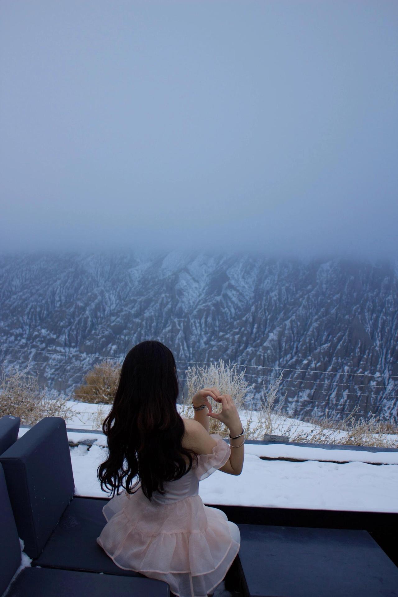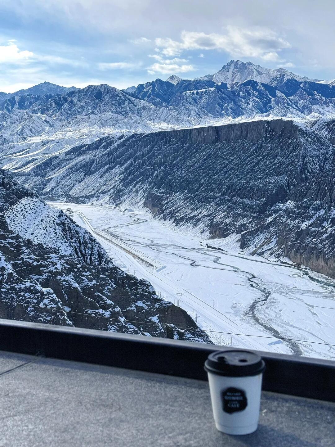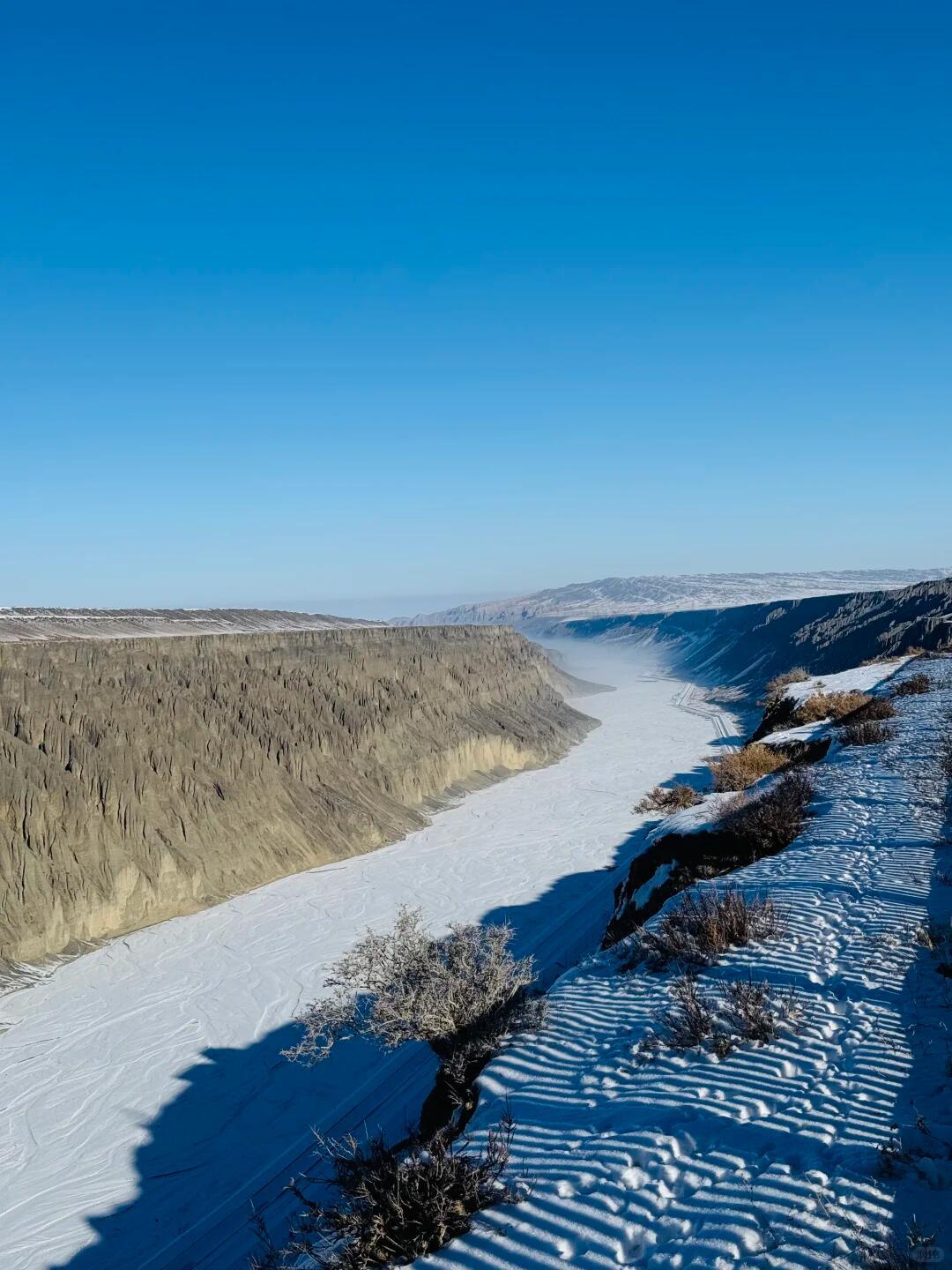 你见过冬天的独山子大峡谷吗? 奎屯河用亿万年时间,在天山北麓刻出这道大地裂痕,将褶皱与岩层裸呈于世,也把荒野的粗砺与雪峰的静谧缝合在同一条视域里。 冬日里,谷底河流冰封,雪覆阶地,反倒衬出崖壁肌理的苍劲。电影《飞驰人生》曾在此取景,赛车呼啸而过的镜头,刚好呼应了峡谷本身那种被时间冲刷出的速度感。 观景台边的悬崖咖啡馆,是为这场旷野相遇准备的温柔注脚。 你可以捧一杯热咖啡,看雾气从谷底缓慢升腾,把对岸的雪峰与近处的枯草揉进同一片朦胧。 若赶上晴空,阳光会将峡谷的棕褐与雪原的银白调和得格外温柔,此时按下快门,便能收下这份属于北疆的、兼具磅礴与细腻的浪漫。