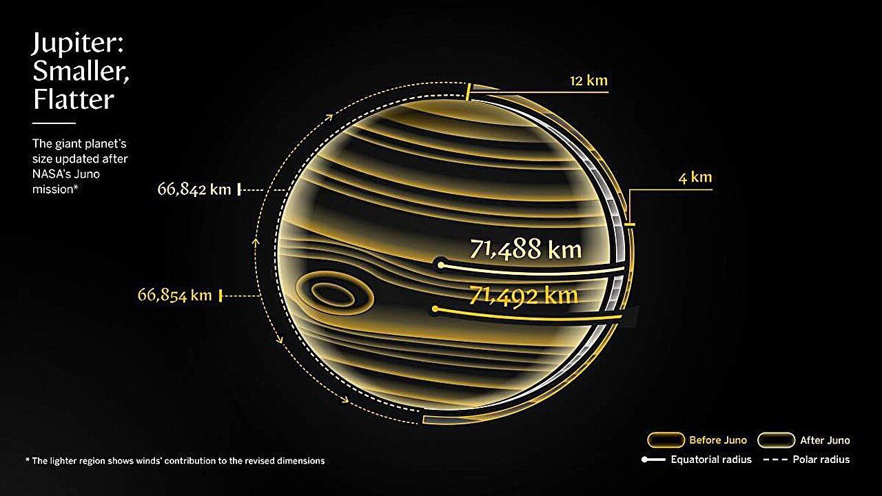 【NASA朱诺任务精确测量木星尺寸,较此前认知略小略扁】美国国家航空航天局(NASA)的朱诺任务最新数据表明,太阳系中最大的行星木星,其实际尺寸略小于先前估算,形状也更为扁平。通过分析朱诺探测器13次飞掠木星期间获取的无线电掩星数据,并综合考虑木星带状风的影响,任务科学家确定,木星赤道半径比此前测量值窄约8公里,两极方向则扁平约24公里。此前对木星物理尺寸的认知,主要基于20世纪70年代先驱者号和旅行者号任务执行的六次无线电掩星实验。无线电掩星技术用于“透视”木星浓密不透明的大气层,以探测其内部结构。在该实验中,朱诺探测器向地球上的NASA深空网络发射无线电信号。当这些信号穿过木星带电的高层大气(即电离层)时,会受到气体影响而发生弯曲和延迟。通过测量这种频率变化,科学家可以计算出木星大气不同深度的温度、压力及电子密度。木星的精确半径是构建其他恒星系统中巨行星模型的关键校准标准。获取更准确的木星形状,将有助于天文学家更好地解读那些在遥远恒星前方凌日的系外行星的观测数据。