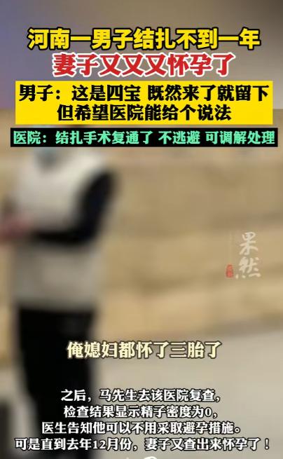 “万万没想到!”河南,一男子已经有了3个孩子,因心疼妻子分娩之苦,便去做了结扎手术,不料,妻子再次怀孕,男子去医院一查,发现自己精子质量正常,男子虽然觉得该医院不靠谱,但还是决定留下孩子! 河南郑州一位三孩父亲的暖心举动,最后却迎来了一个哭笑不得的意外结局。本是心疼妻子接连生育遭罪,主动花 1800 元做结扎手术想给妻子彻底减负。 结果术后不到一年,妻子的验孕棒上赫然出现两道红杠,这波突如其来的状况,直接让这位大哥陷入了懵圈状态。 这位大哥在河南当地生活,家里的三个孩子全是媳妇剖腹产生下的,熟悉剖腹产的人都知道,一次手术就够伤身体,三次下来,媳妇的身体底子明显受了影响,每次产后恢复都要熬上好几个月,腰酸腹痛、伤口不适都是常事。 大哥看在眼里疼在心里,一直觉得避孕这事儿不能只让女人来扛,查了不少资料后得知,男性结扎是微创小手术,恢复快还不用长期吃药,比女性避孕要省心太多。 当地一级医院的这类手术收费本就处于 800-2000 元区间,1800 元的花费完全符合常规,大哥便下定决心去做这个手术。 2025 年 1 月 23 日,他特意请假来到当地医院,确认身体符合手术条件后,签署了手术知情同意书,顺利接受了输精管结扎手术。 整个手术过程十分顺利,术后观察两小时没有出现任何异常,大哥便出院回家休养,后续恢复的过程也一直很顺利,没出现什么不适。 术后第 30 天,大哥严格按医嘱去医院做了复查,负责的医生还特意在微信上跟他说 “结果没问题,以后不用做任何避孕措施了”。 得到医生的准话,大哥心里的石头彻底落了地,想着这手术花的钱、受的小罪都值了,媳妇终于不用再担心意外怀孕的事儿,也不用再受避孕的折腾。 一家人以后就能踏踏实实过日子了。那时候的他,完全没把后续的复查放在心上,毕竟谁也不会想到,那种极低概率的意外,会发生在自己身上。 日子就这么平平淡淡地过着,转眼到了 2025 年 12 月,距离大哥做结扎手术刚满 11 个月,意外却毫无征兆地发生了。 大哥的妻子生理期迟迟没来,一开始夫妻俩都没当回事,只以为是普通的月经不调,毕竟之前也有过类似的情况。 可没想到过了快半个月,月经还是没有来的迹象,妻子心里开始发慌,跟大哥说 “要不还是买个验孕棒测测吧,图个放心”。 大哥当时还笑着调侃,说这纯属多此一举,自己都做了结扎,怎么可能怀孕,可架不住媳妇的坚持,还是买了三个不同品牌的验孕棒回家。 结果这一测,夫妻俩直接愣在原地,三根验孕棒上都出现了清晰的两道红杠,颜色还特别深,一点都不含糊。大哥反复看了好几遍,还是不敢相信,又让媳妇重新测了一次,结果依旧如此。 第二天一早,夫妻俩就急匆匆地赶到医院,先给妻子做了孕检,检查结果明确显示已经怀孕,这个消息让两人心里五味杂陈。 紧接着,大哥又做了一次详细的检查,发现结扎手术复通了,这也是导致妻子意外怀孕的直接原因。 医生还解释,管道自然复通的发生概率仅有 0.1%-0.15%,大多出现在术后 1-2 年内,大哥的情况正好符合这个规律。 得知这个结果,大哥又气又无奈,觉得这医院实在不靠谱,自己花了钱遭了罪做结扎手术,结果却落得这样的下场,当即拿着检查报告找到医院讨说法。 医院的工作人员接到大哥的反馈后,立刻对整个事件做了详细的核查,最终承认了管道自然复通的事实。 明确表示不会逃避任何责任,愿意和大哥协商处理后续的相关问题,还提出可以通过当地医疗纠纷人民调解委员会进行专业调解,目前双方还在进一步的沟通协商中。 虽然心里对医院的做法十分不满,也觉得这场意外来得实在离谱,但看着妻子的孕检单,大哥和妻子商量了很久,最终还是决定把这个意外到来的孩子留下来。 大哥说,这就是缘分,既然孩子来了,那就是家里的四宝,不管以后的生活有多辛苦,都会好好把这个孩子养大。 男性结扎手术并非一劳永逸,医学指南明确要求,术后需要在 1、3、6 个月各做一次检查,三次检查都确认无活性,且浓度低于安全阈值,才算真正的避孕成功。 大哥此次的经历,既因为自己没有严格遵医嘱完成后续复查,也因为医院在术前告知环节存在疏漏,没有以书面形式明确强调复通的小概率风险和后续复查的重要性,只是通过口头和微信进行了简单告知,这才导致了这场意外的发生。 一场暖心之举,意外酿成一段哭笑不得的插曲,却最终以温柔收尾,大哥心疼妻子的初心,是婚姻里最动人的模样,而接纳意外到来的孩子,更是一个家庭的担当与温情。 对于这件事,您有什么想说的吗?欢迎评论区留言讨论。 信源:齐鲁晚报·果然视频2026-02-04——《河南一男子结扎不到一年妻子再次怀孕,当事人:心疼妻子已生3个孩子;医院回应:结扎手术复通了,不逃避,可调解处理》