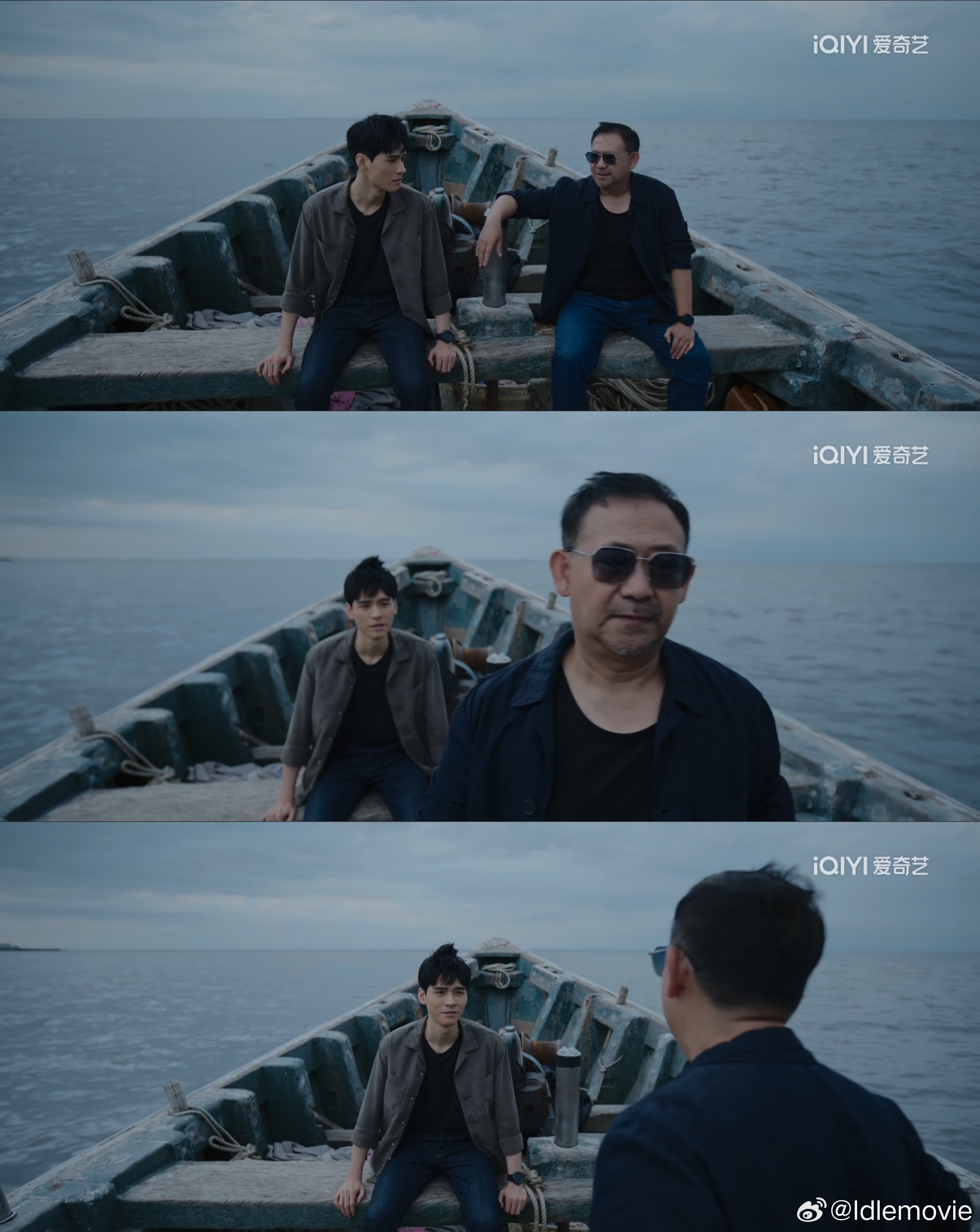 图四 法律容不下半点恶,但执法讲究温度人情,色调偏绿色的暖色调便是表达此意,叶谦答应将何长春爸妈的骨灰撒向大海就是留一个善念,再看构图,龚俊、姜武一开始都处在画面中心,随后姜武起身,主体先是姜武后是龚俊,意为他俩都不要再把自己困在过去和当下,放下我执,鲜活活着。