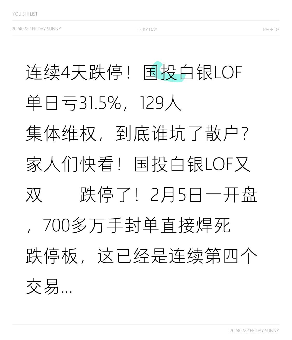 连续4天跌停!国投白银LOF单日亏31.5%,129人集体维权,到底谁坑了散户? 家人们快看!国投白银LOF又双叒叕跌停了!2月5日一开盘,700多万手封单直接焊死跌停板,这已经是连续第四个交易日一字跌停,高位进场的散户想跑都跑不掉! 更狠的是,这只基金刚创下公募史上最狠暴跌——单日净值狂跌31.5%,有人800本金直接亏没200多,重仓的更是一天亏掉半年工资!原本跟着白银牛市疯狂套利的散户,现在集体傻眼,黑猫投诉平台上129条投诉直指国投瑞银,到底发生了什么? 关键转折点来了!这波暴跌根本不是单纯银价下跌,而是基金公司的“突袭式操作”。1月30日伦敦银单日暴跌26%,但国内沪银有17%涨跌停限制,国投白银LOF一直按国内价格估值,净值被硬生生托住,形成了64%的离谱溢价。可就在2月2日收盘后,基金公司突然深夜发公告,宣布改用国际银价估值,当天净值直接砍去三成! 最让散户愤怒的是“信息差杀熟”:国际银价周末就崩盘了,基金公司捂了两天不吭声,等到大家白天交易、赎回后才公布规则,导致很多人以为只亏17%,结果晚上一看亏了31.5%,稀里糊涂多亏十几万。更讽刺的是,这只基金之前靠限购100元推高溢价,让散户疯狂追捧,现在跌起来却比谁都狠。 基金公司解释说“调整估值是为了公平”,怕早赎回的人占便宜。可道理再对,也不能用“突袭”的方式对待投资者吧?整个周末不发任何预警,交易结束才改规则,把散户架在火上烤。要知道,这只基金去年规模从22亿飙到189亿,管理费赚得盆满钵满,现在却连最基本的风险提示都做不到。 现在跌停板封单超700万手,场内价格还比净值高37%,后续可能还要跌。那些冲着“套利教程”进场的新手,以为能捡便宜,结果成了接盘侠。其实大家愤怒的不是亏钱,而是被当成傻子耍——涨的时候停牌限流,跌的时候突然改规则,基金公司赚着管理费,却把风险全甩给散户。 投资有风险没错,但不能是被人蒙着眼睛踩坑!评论区说说,你有没有买这只基金?你觉得基金公司该不该给散户一个说法?点赞关注,后续有最新进展第一时间同步,也提醒身边人别再被高溢价基金割韭菜!