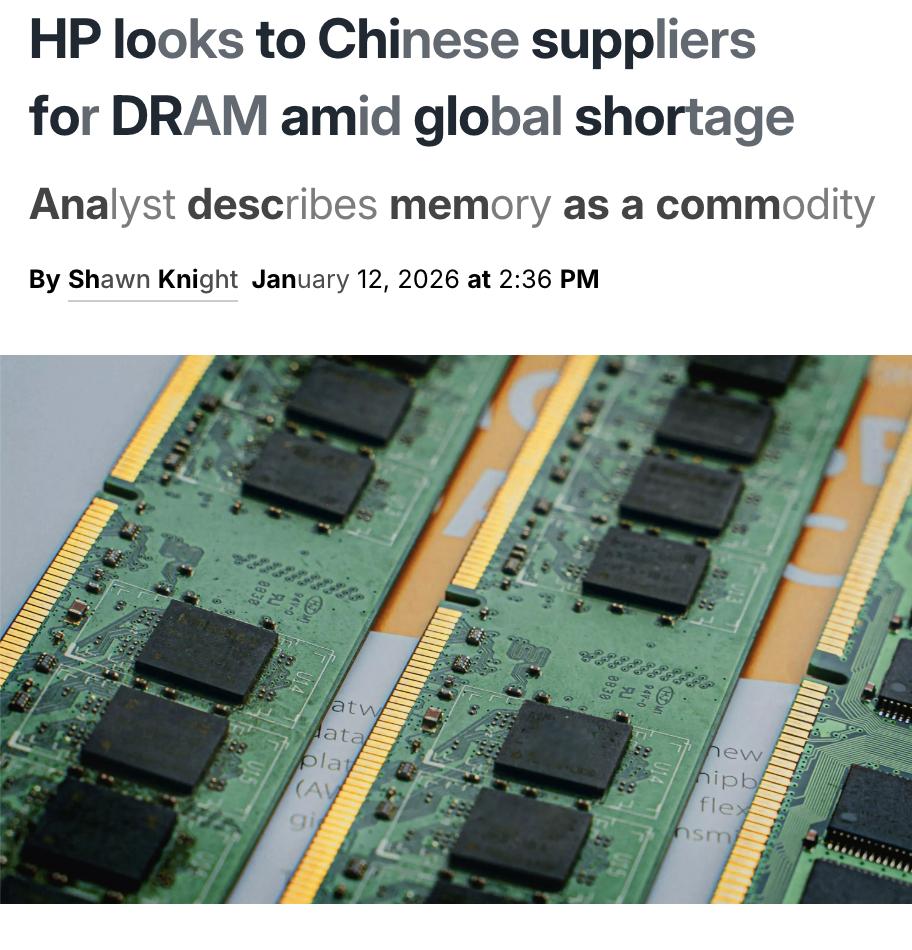 外媒:惠普管理层近期告知美国银行,正在评估来自中国的额外内存供应商。这虽非最终确认,但评估供应商是第一步。 内存芯片类似可轻易替换的商品,而非像英伟达那样的专有AI芯片,因此惠普可将主要供应商三星、美光或SK海力士的产品与小众中国制造商的库存相结合,消费者通常不会介意内存芯片的来源,只要其正常工作且价格合理。 不过,这一转变可能需一年以上时间。目前,AI热潮正加剧内存短缺,一些系统构建商开始恐慌性购买剩余内存,这可能使短缺持续至2027年。