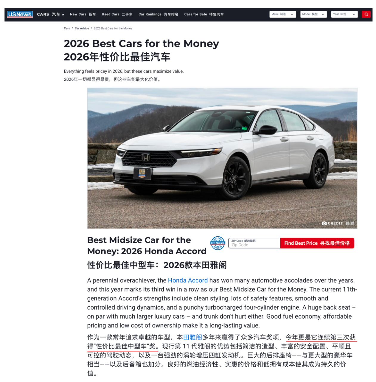 简单说下这个奖:《Car and Driver》的10Best是全球公认的老牌权威榜单,测试严、标准高,能连续几十年被它认可,本身就是实力的证明。50年拿了40次奖,什么概念?相当于雅阁诞生以来,八成的年份都没缺席过这份榜单。