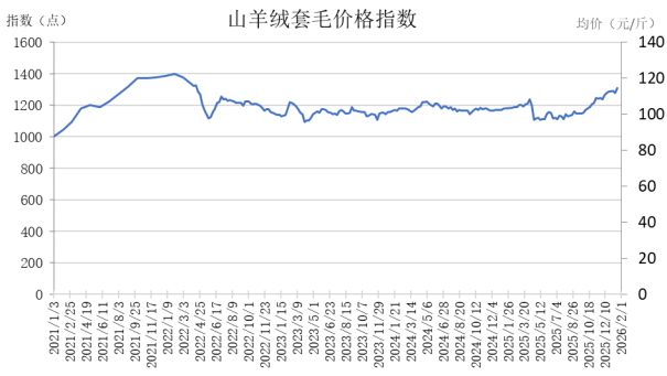 截至2月1日,山羊绒(套毛)价格指数报1327.21点,较上期上涨1.58%,山羊绒(套毛)价格报115.6元/斤,较上期上涨1.8元/斤。