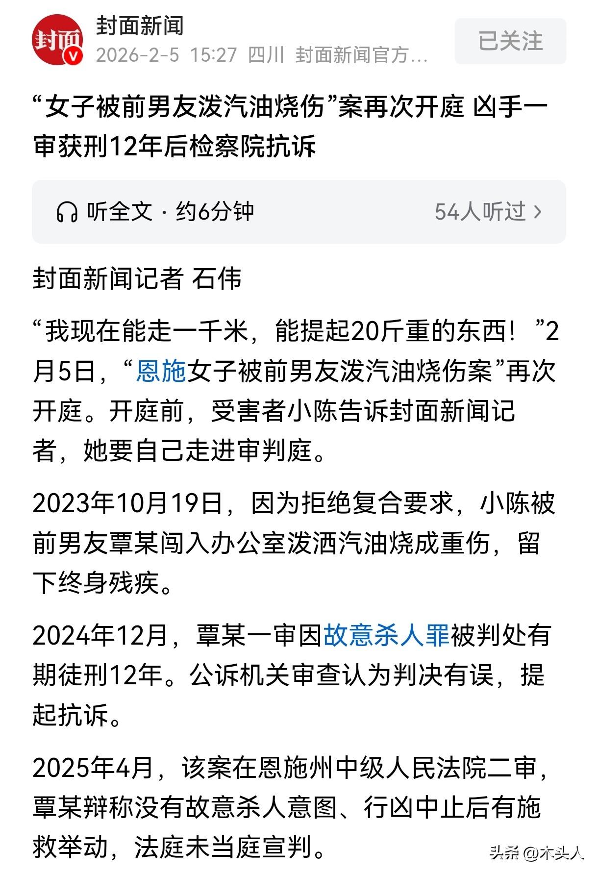 这代价太大了!湖北恩施,男子和女友恋爱3年,提出分手后,又恳求女子复合,女子不愿意,男子闯入女子办公室,泼洒汽油将女子烧成重伤。事发后男子因故意杀人罪获刑11年,二审时男子却称自己没有杀人意图,是犯罪中止,有主动对女方施救。网友:可以不爱,但请不要伤害,这种偏激的人,真的太可怕了。 2020年6月,小陈和大自己一岁的覃某确定了恋爱关系,刚开始,她觉得覃某性格老实,虽不善言辞,可两人却有着共同的话题,惺惺相惜。 覃某父母离异,他和弟弟跟着父亲生活,弟弟患病,家庭负担重,覃某学会开挖掘机后,一直在工地打工。 父母知道小陈恋爱后,担心女儿跟着覃某会吃苦,劝她分手,可小陈认定了覃某,觉得他没有不好的嗜好、工作认真,还愿意当上门女婿,是个不错的结婚对象。 两人交往3年,还见过双方父母,但是两人的感情并非一直甜蜜,而是分分合合,两人一旦发生争执,覃某总爱说些难听的话,甚至动过手,可即使这样,小陈还是死心塌地的跟着对方。 2023年7月,两人因琐事发生争吵,覃某再次提出分手,小陈身心俱疲,觉得对方根本不珍惜这段感情,想分手就分手,想复合就复合,这一次,她想彻底结束这段恋情。 之后覃某又求复合,还发极端照片威胁小陈,说要烧床单、跳河,小陈心意已决,说两人可以做朋友,并劝覃某好好生活。 覃某哪肯罢休,2023年10月18日,他跑到小陈上班的地方纠缠,小陈报警后,他答应不再纠缠。 不料,第二天他竟带着水果刀和汽油,闯进办公室,对小陈泼汽油,还放下狠话:“我不好过,你也别想好过!” 说完就点燃汽油,小陈瞬间被大火吞噬,着火后,覃某还往小陈逃跑方向泼汽油,看到小陈倒地哭喊才心软,脱下卫衣灭火,又打湿继续扑救。 火灭后,小陈昏迷,覃某抱着小陈出办公室,让小陈同事联系救护车,同事报警,送医途中覃某被警方带走。 这场大火让小陈全身70%重度烧伤,左手手指全截肢,命运彻底改变。 她昏迷1个多月,4个多月躺着不能动弹,做了12次植皮手术,花了上百万元医药费,后续还得手术除疤,现在她生活不能自理,吃饭都得有人喂。 一审法院认为覃某构成故意杀人罪,是犯罪未遂,事后施救、有自首情节,还支付了59300余元医药费,对他从轻处罚。 《刑法》第232条规定:故意杀人的,处死刑、无期徒刑或者十年以上有期徒刑。 对于未遂犯,可以比照既遂犯从轻或者减轻处罚。 一审法院判决覃某犯故意杀人罪,判处其有期徒刑12年。 小陈认为这个判罚太轻,提起了抗诉,公诉机关也认为判决有误,提起抗诉。 二审时,覃某坚称自己没有故意杀人意图,不是犯罪未遂,而是中止,他在行凶过程中中止,对小陈予以施救,他认为自己是故意伤害罪,而非故意杀人罪。 《刑法》第234条规定:故意伤害他人身体的,致人重伤的,处三年以上十年以下有期徒刑;致人死亡或者以特别残忍手段致人重伤造成严重残疾的,处十年以上有期徒刑、无期徒刑或者死刑。 两罪的的主要区别在于是否以非法剥夺他人生命为故意,如果行为人没有这种非法剥夺他人生命的故意,而只有伤害他人身体健康的故意,即使行为导致了他人的死亡,也只能认定为故意伤害罪。 如果行为人有非法剥夺他人生命的故意,即使其行为没有造成他人死亡的结果,也构成故意杀人罪(未遂)。 2026年2月6日,该案再次开庭,但暂未当庭宣判。 对于覃某到底是故意杀人罪,还是故意伤害罪,暂未有定论。 小陈认为自己没有骗覃某钱和感情,实在想不通对方为什么要这样对她,她只希望此事能够尽快有个结果,自己能够好好生活。 小陈和覃某恋爱交往,覃某提出分手后,小陈认为覃某不好好珍惜这段感情,希望两人好聚好散,并劝对方好好生活。 可覃某没有反思两人分手的原因,反复纠缠小陈,甚至以极端的方式报复,他的行为不仅违背了公序良俗,还构成了违法犯罪,理应为自己的行为付出代价。 有人说:可以不爱,但请别伤害,这种人太偏激,太可怕了,好好的一个姑娘,就这样被对方毁了,实在让人惋惜。 也有人认为应该对覃某从重处罚,这种泼汽油,烧伤他人的行为,实在太恶劣了,应当严惩。 对于此事,大家怎么看?