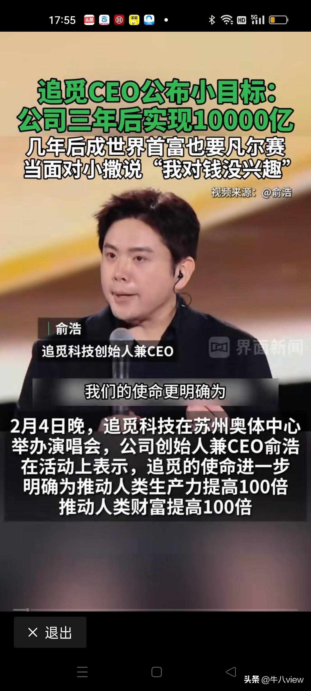 有钱人是真的会吹牛!曾经大家调侃王总把1亿当成小目标,现在追觅CEO把10000亿当成了小目标。 俞浩放言3年后要实现10000亿的小目标!要推动人类的生产力和财富提高100倍。 说这话的人热血沸腾,听这话的人也是热血沸腾,照他这么说,人类的生产力和财富提高100倍看来要指望他了,我们能不能富裕,国家能不能强大可能要依靠追觅这家公司了!你们信吗? 一个研发吸尘器高速马达的公司要成为世界首富???凭啥?? 原来这公司2024年全球营收150亿,预计2025年营收300亿,差不多10%的净收益。 目前,追觅科技的业务已覆盖全球120多个国家和地区,全球实体门店超过6500家,累计服务家庭超4200万户。追觅旗下多项核心业务稳居全球行业前三,其扫地机器人在30个国家市场占有率位居第一,洗地机业务在17个国家和地区排名第一,部分市场市占率突破70%。 从营收和市场占有率来看确实势头不错,但是要想成为世界首富确实还有很长路要走。首先要超过民营企业京东集团的1万亿营收还有太大差距,更别说超过中字头和国字头企业。10000亿不是小目标而是大目标。 想成为世界首富有这梦想是好事,但也得脚踏实地的去发展,至少看看需要超越多少家公司才能挤进世界500强企业首列!超越的公司太多太多,国内和国外的一大堆!最后希望把吹过的牛都实现了!