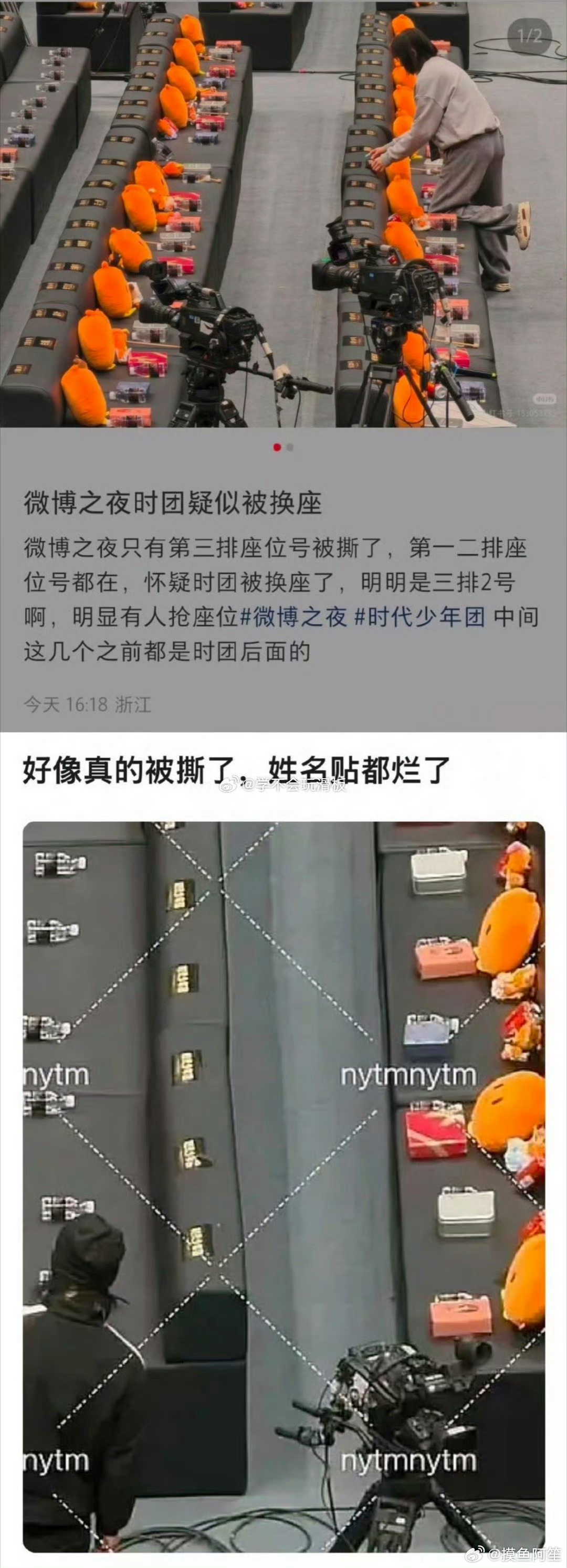 时代少年团在微博之夜内场也被换座,姓名贴都撕烂了