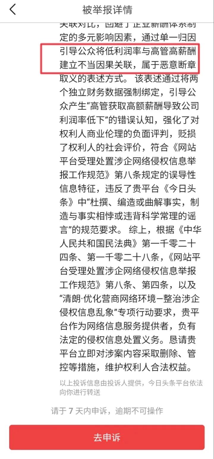 联想竟然盯上俺这个小民了,把俺许久以前发的一篇头条给投诉下架了。 俺没有几个粉丝,发的头条阅读量也少,被投诉的文章是去年发的,谁知联想这家国际大公司的法务还能跟踪到俺这里[我想静静]。 起因是这篇文章质疑联想的低利润率和高管的高薪酬,结果被联想法务投诉说“建立不当因果关联,属于恶意断章取义”。 这就奇怪了,民众普遍认可“多劳多得,少劳少得”。如果联想的利润率高,那么高管拿高薪酬就无人质疑了。但事实情况是,联想的利润率低,高管却拿着高薪酬,这明显不符合大众“多劳多得”的认知呀,怎么会是“恶意断章取义”呢? 当然,联想作为一家全球企业,自有一套全球化的管理方式,某些管理方式难以被传统价值观熏陶的国内民众所理解,这也是很正常的呀。 只是联想不肯包容不同意见,连俺这种小民乏人问津的文章也要封杀,这个手已经这么深入到互联网的每个角落了吗?