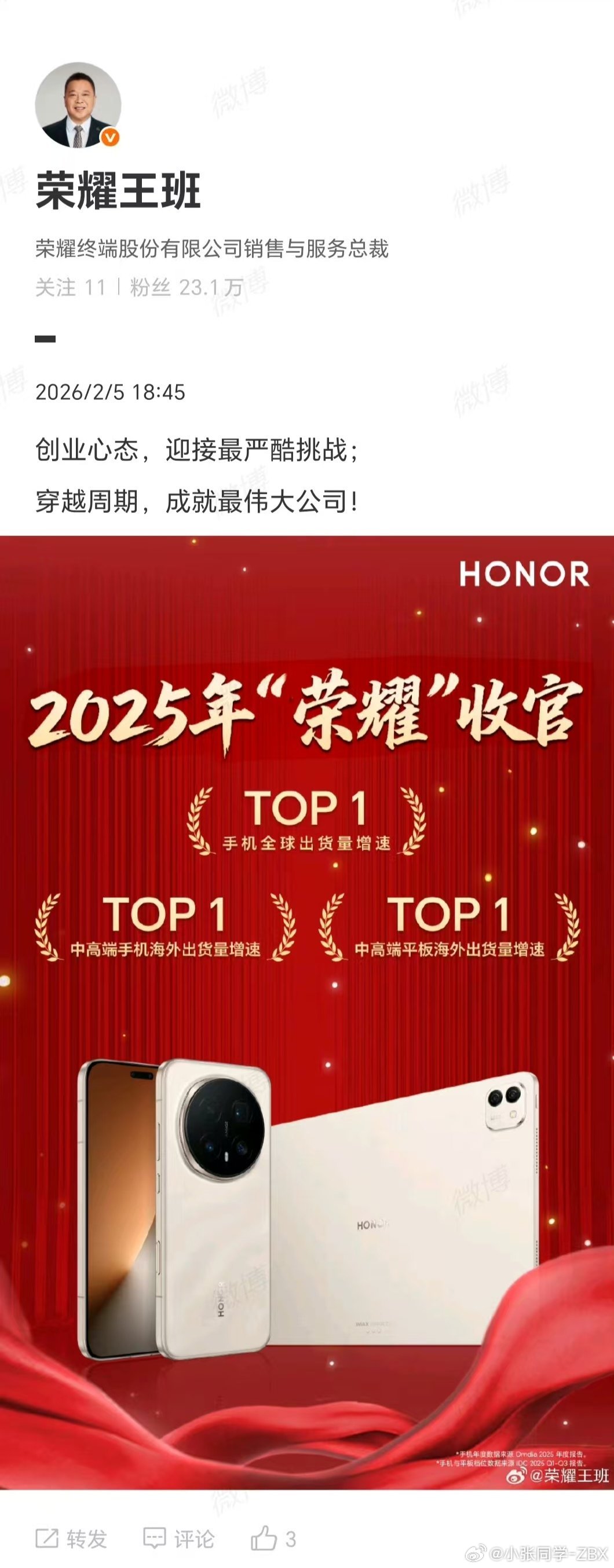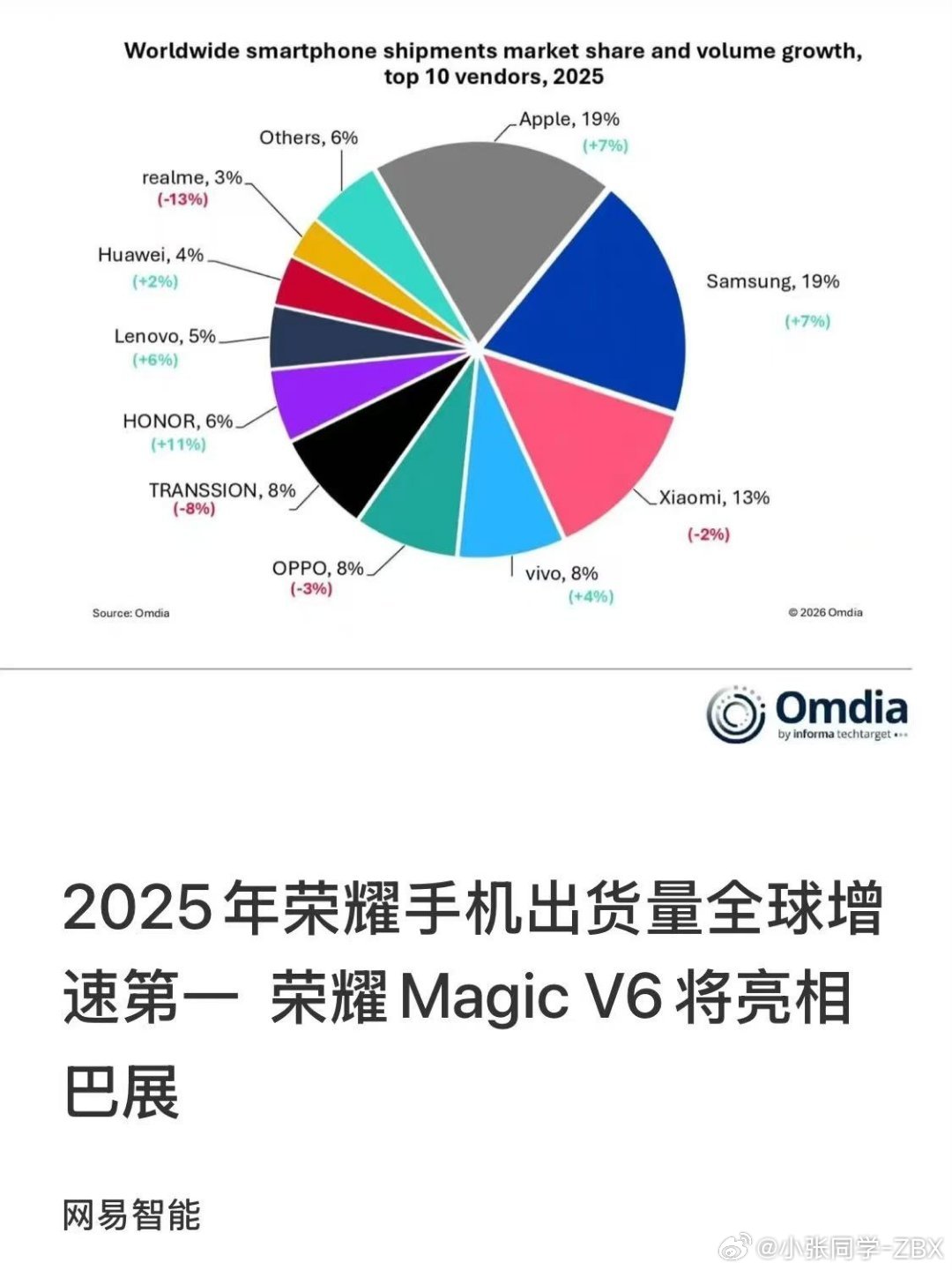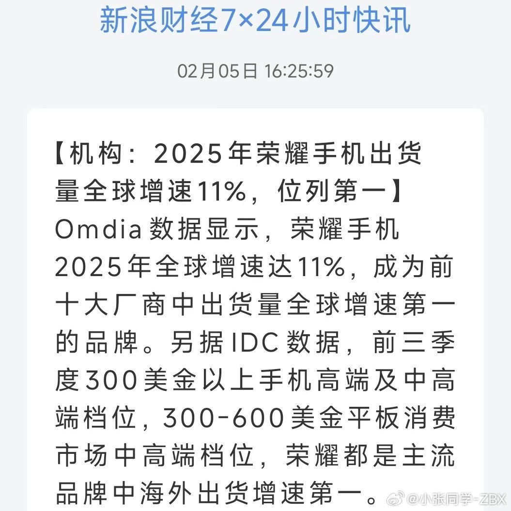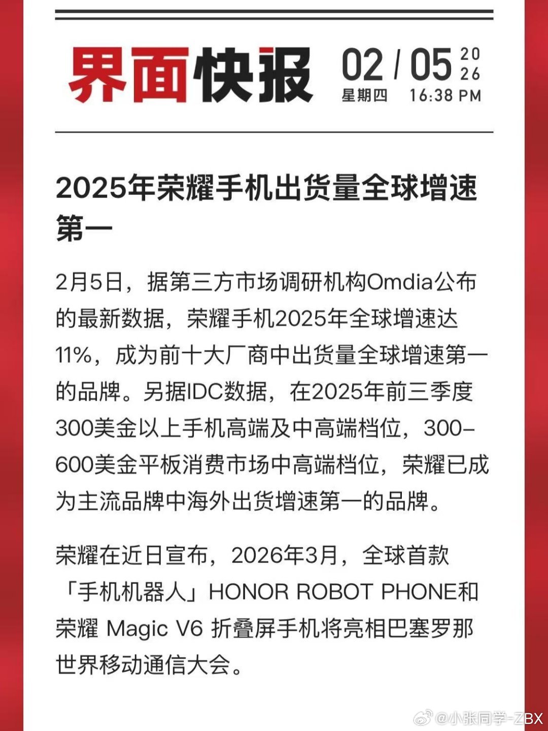 据Omdia统计,荣耀手机2025年全球增速达11%,前十大厂商中出货量全球增速第一的品牌。