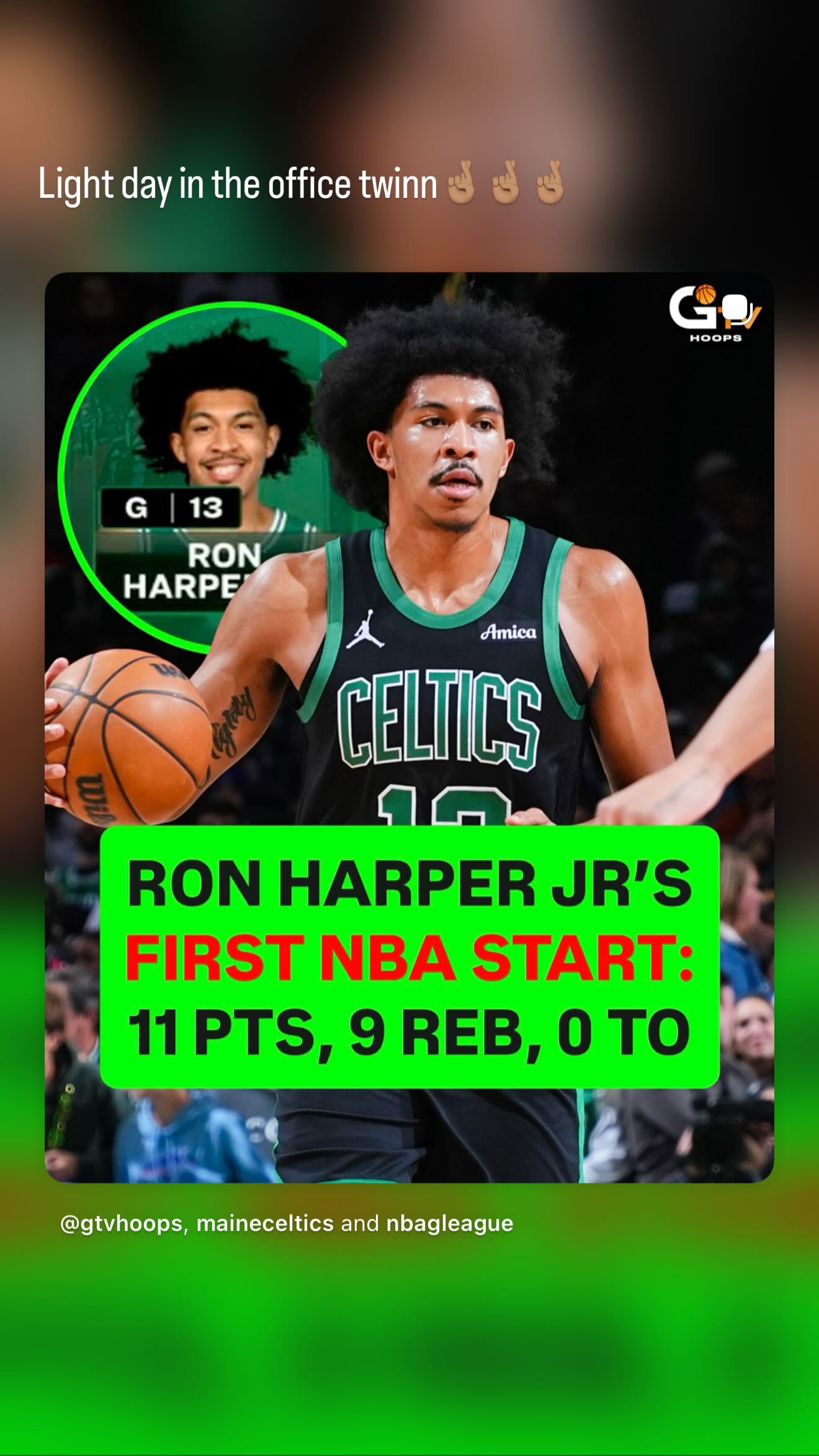 在今日凯尔特人以114-93击败火箭的比赛中,小罗恩-哈珀生涯首次首发出场,其出场33分钟,得到11分9篮板3助攻,投篮8中4。