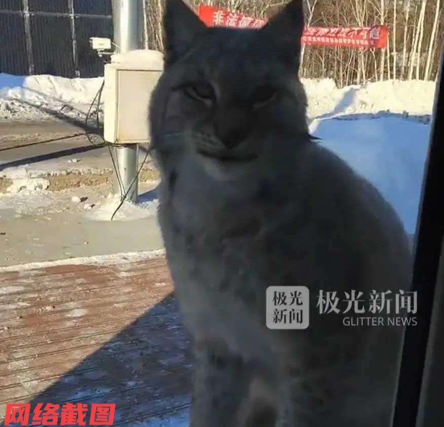 黑龙江大兴安岭处有只猞猁,在途径当地检查站时,此处的工作人员给它投喂了点生肉。