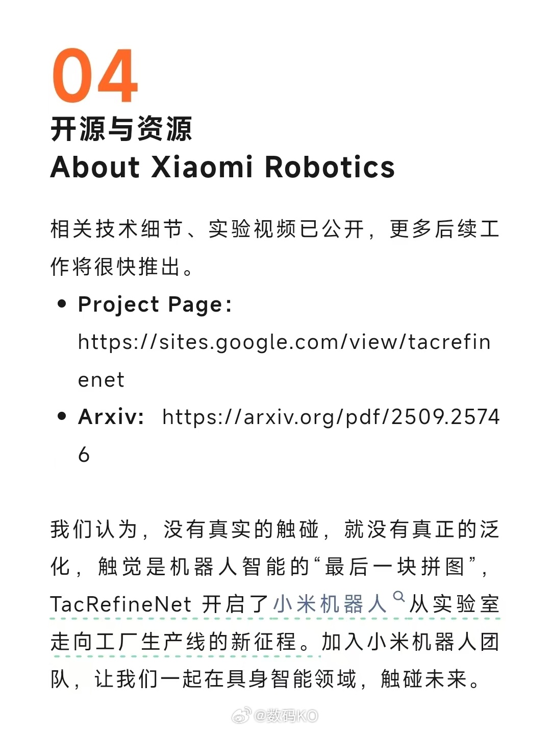 小米技术公布了TacRefineNet:触觉驱动的机器人精细抓取微调模型,公开了相关技术细节,RefineNet明确开源,源代码完全开放并且有PyTorch实现版本。