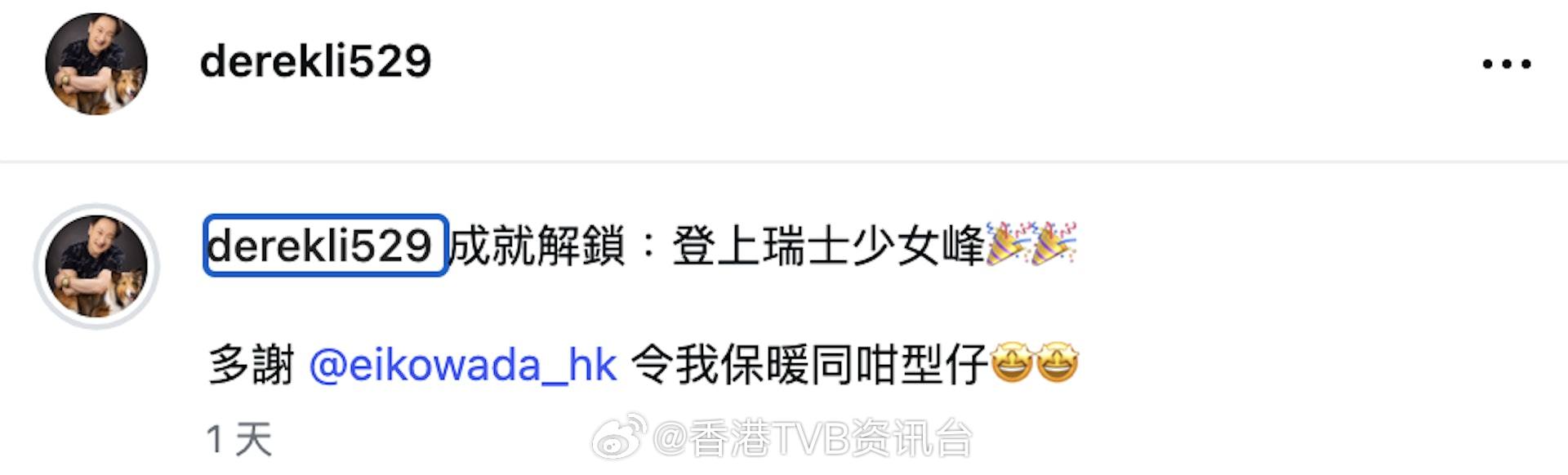 现年52岁、TVB“金牌司仪”李浩林(Derek)精通两文三语,90年代中成为大型节目主持“铁打班底”,早年曾客串多部剧集及电影,近年已大幅减产,2021年主持TVB《2020东京奥运会》后鲜少在香港幕前亮相。李浩林去年透露在北京大学修毕经济课程,似乎已决心转跑道,近年兼任做保险。日前李浩林在登山界又创高峰,晒出登上瑞士少女峰的照片,十分兴奋。