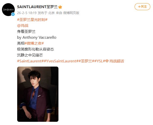 YSL官博目前只正式认领了肖战的造型,独一份的认可👍🏻