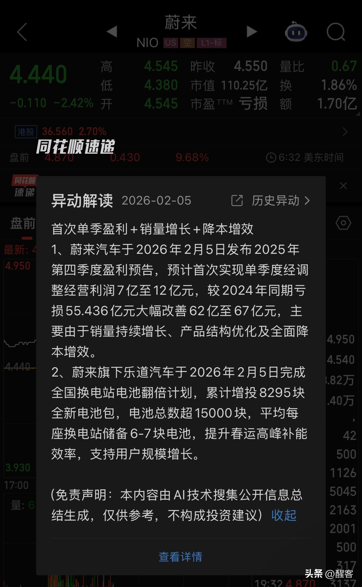 蔚来汽车终于实现盈利,美股股价盘前大涨11%。 蔚来在资本市场发布公告称:预计2025年第四季度经调整经营利润7亿元~12亿元,这是蔚来首次录得单季度经调整经营利润。上年同期,蔚来录得经调整经营亏损55.436亿元。 这是蔚来汽车成立十年以来首次实现盈利,根本原因在于新款ES8成为大型SUV销冠,为蔚来“十年磨一剑”耐心和产品沉淀注入了持续的动力和信心。 即使2025年第四季度实现盈利,蔚来要整体盈利还有一段时间的路要走,毕竟蔚来的模式注定了其重资产运营和盈利能力十分艰难。纵观新势力车企,理想汽车作为最先盈利的品牌,过早的盈利也成为制约其发展潜力的羁绊。 这是行业的前车之鉴,蔚来必须予以高度重视。