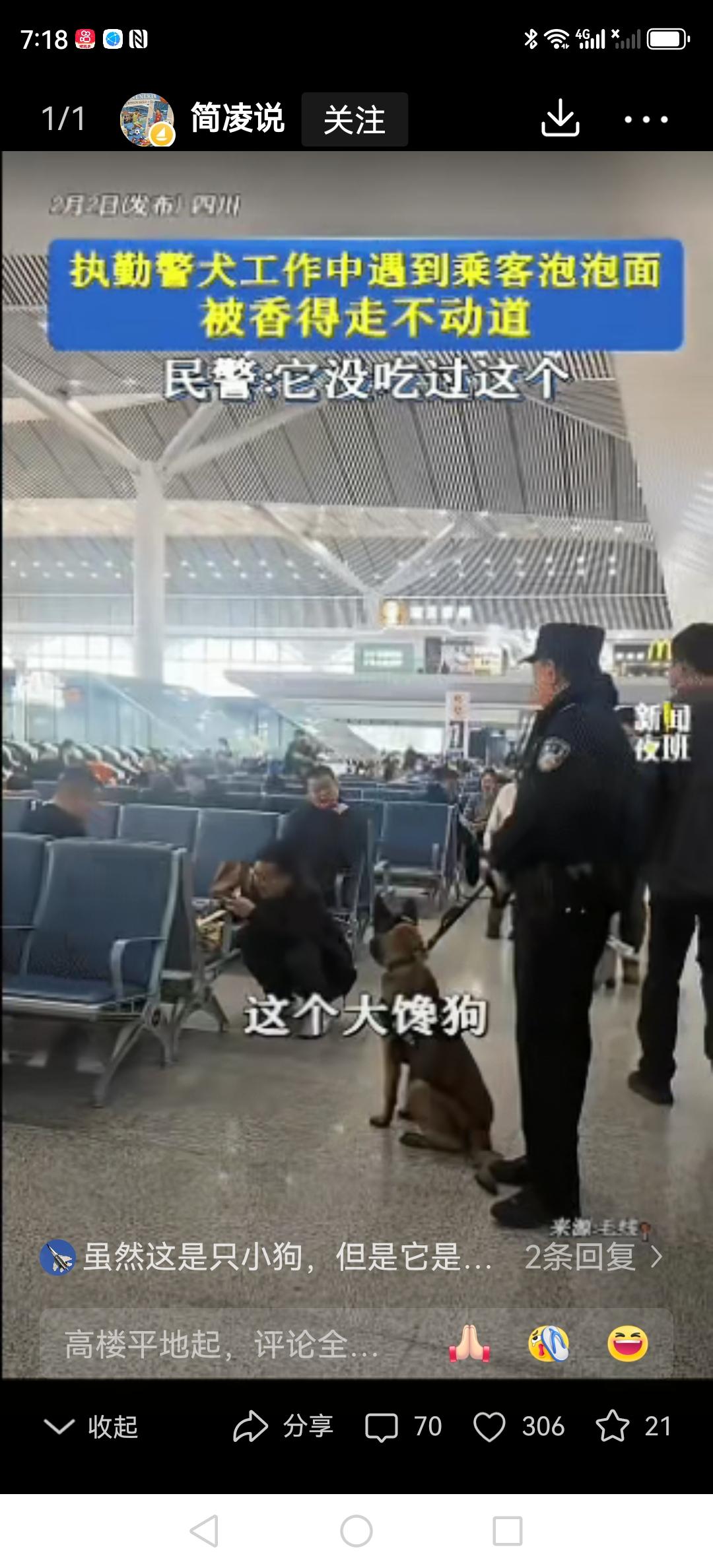 警犬执勤被泡面香整不会了! 民警拉都拉不回来,围观群众笑到直不起腰:这谁扛得住啊! 四川某车站上演了个超搞笑的小插曲:执勤的警犬突然像被按了暂停键似的定住了,民警拉了好几下都纹丝不动。 一开始大家还以为它发现了什么可疑物品,结果凑近一看才知道,这小家伙是被旁边乘客手里的泡面香味勾住了魂,一步都挪不动道! 你瞧它,眼睛直勾勾地盯着那碗泡面,口水都快顺着嘴角流下来了,周围的乘客都被它这副馋样逗得哈哈大笑。 民警有点不好意思地解释:"它平时没吃过这个味儿的泡面。" 这下现场更热闹了,大家都围着看这只可爱的警犬,简直成了大型吸狗现场。网友们在网上也炸开了锅,纷纷出主意:"要是这次任务完成得好,就奖励它一碗泡面!""要不夹一筷子给它尝尝?"其实啊,警犬也是个小毛孩,工作的时候特别威风,可一闻到好吃的,立马就变成一只馋嘴的小猫。 这种又威风又有点小馋的反差,让人一下子就想到自家狗子平时跟你讨食的样子。 不过警犬毕竟是训练过的,虽然馋得不行,但也知道不能真扑上去。你看它规规矩矩坐在那儿流着口水的小模样,简直跟减肥时的你一模一样——明明告诉自己不能吃,可眼睛就是离不开那香味儿!要是你家狗子也这样,你会给它尝一口吗? -search.byteimg.com/img/labis/8379cfed5d51f9351e75e40ab1279a54~480x480.JPEG警犬队伍 警犬大队 警犬测试 警犬队列训练 警犬首训 警犬温情照 大狗拦路