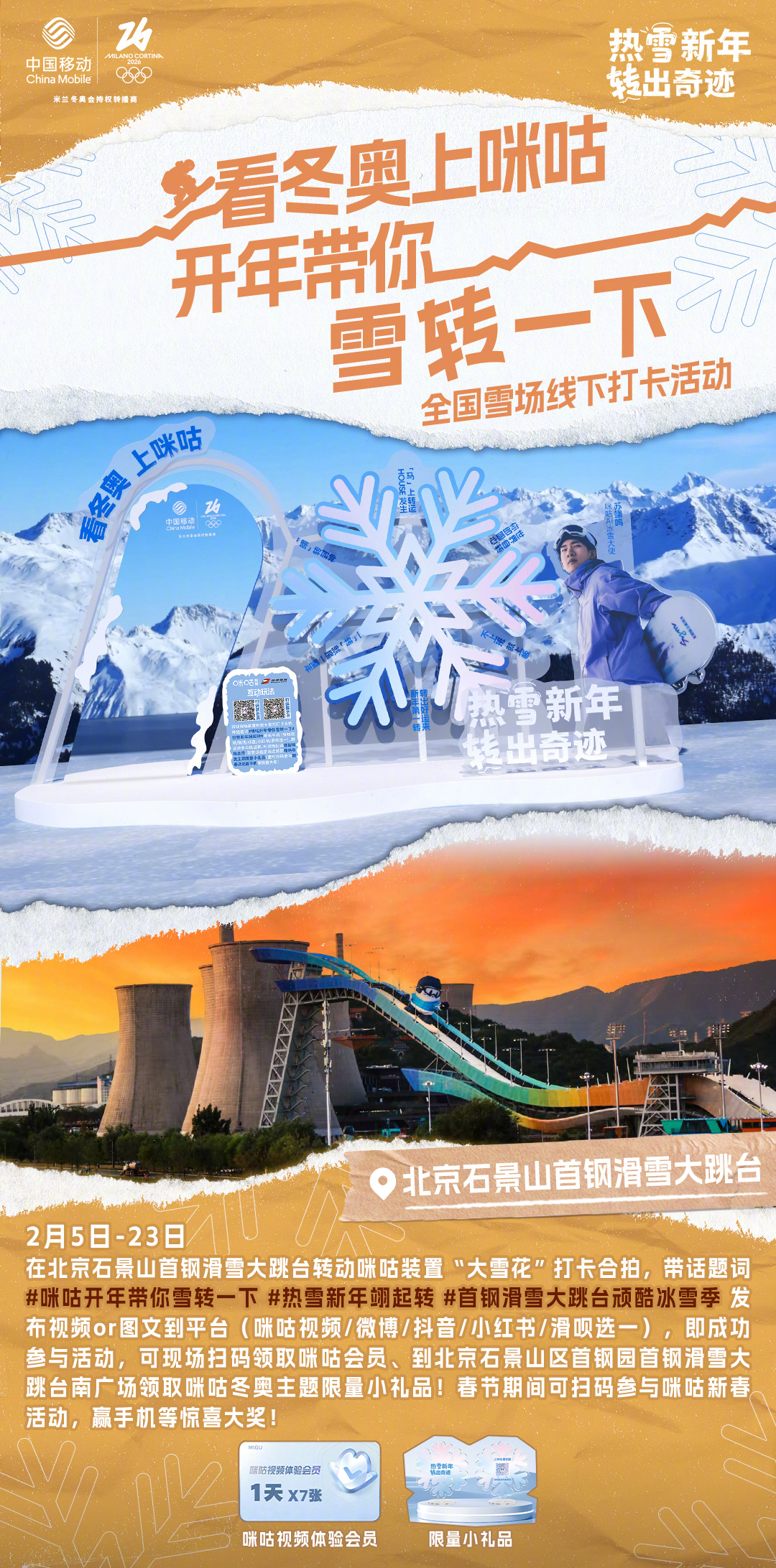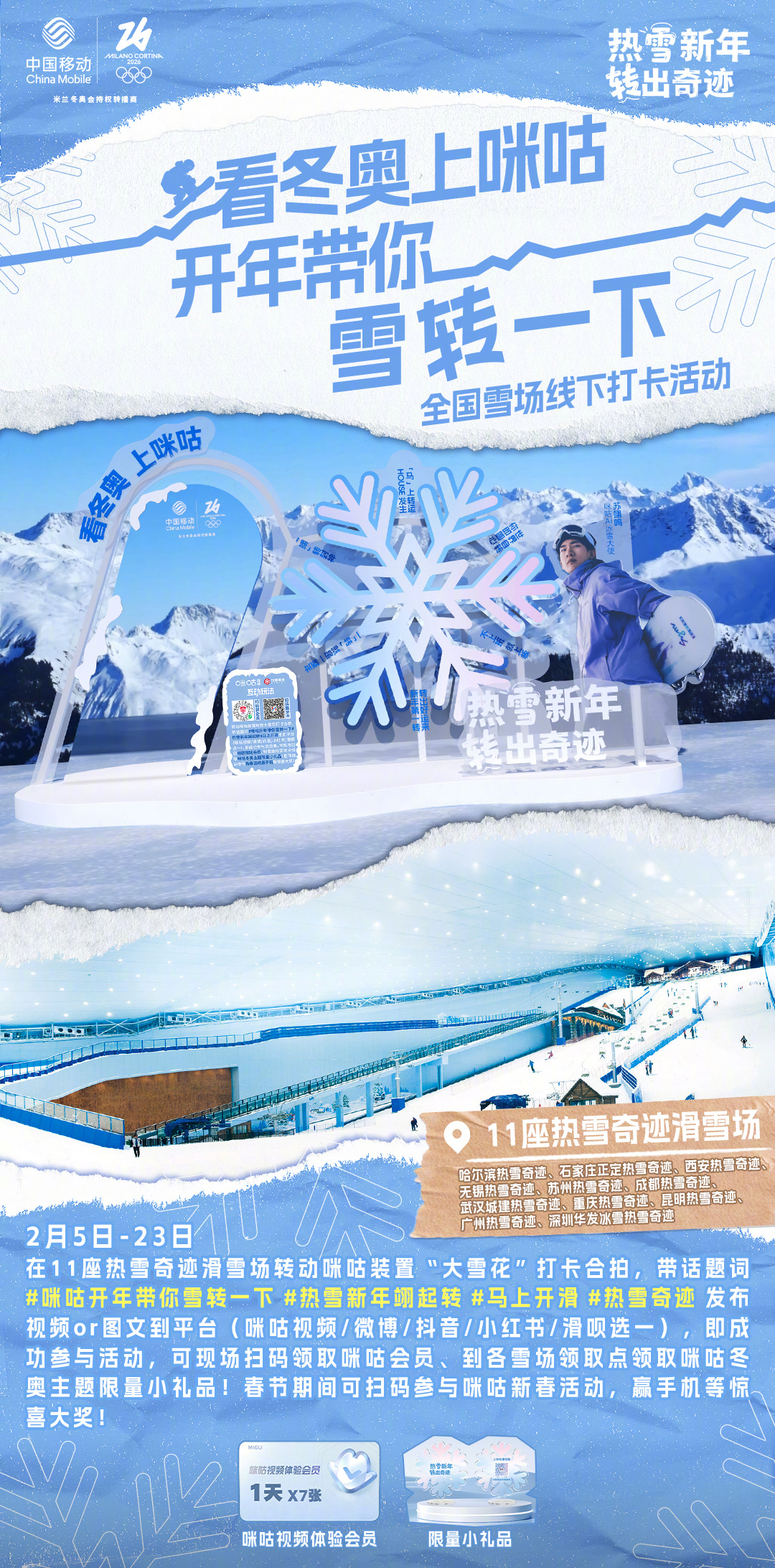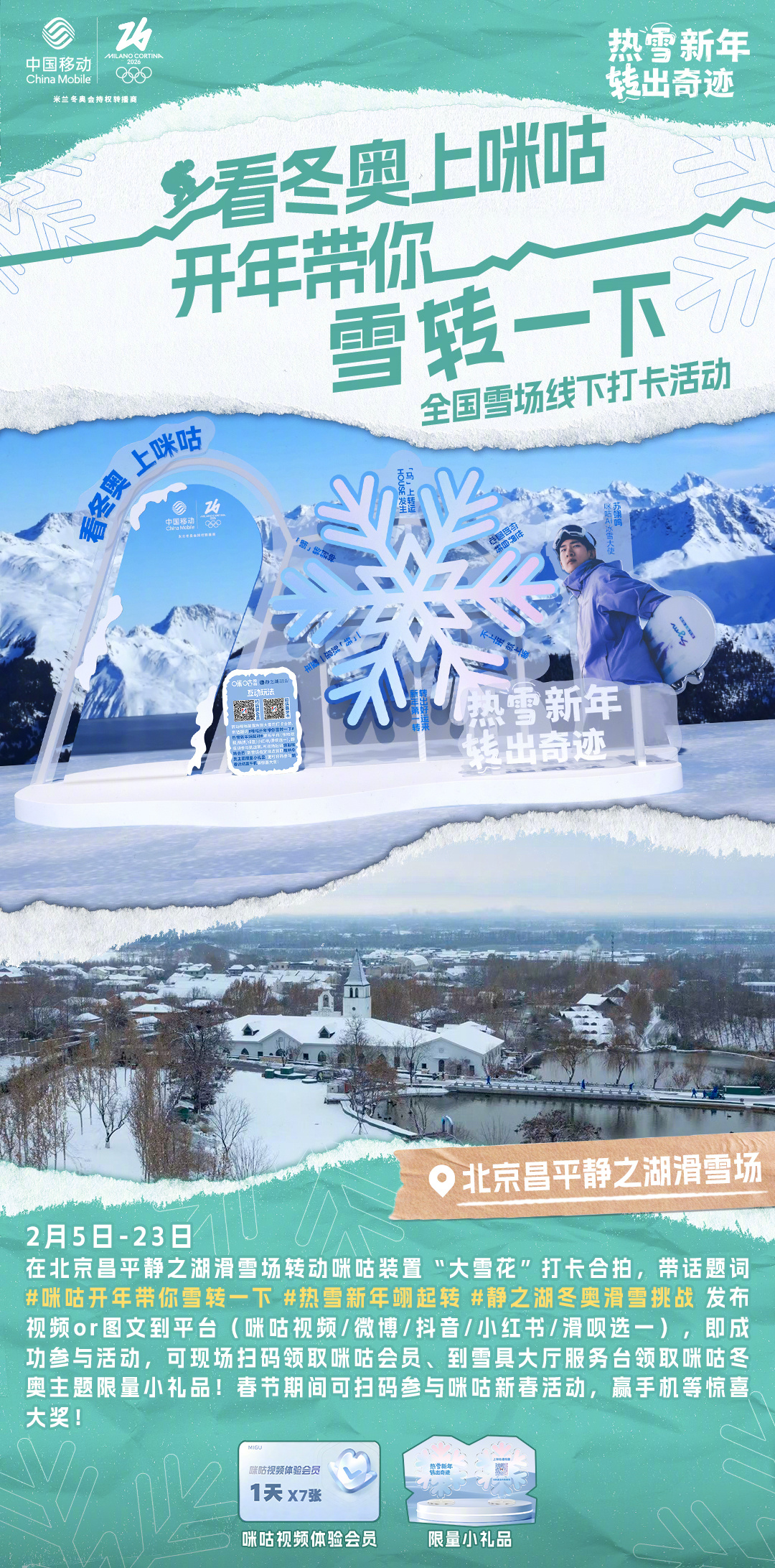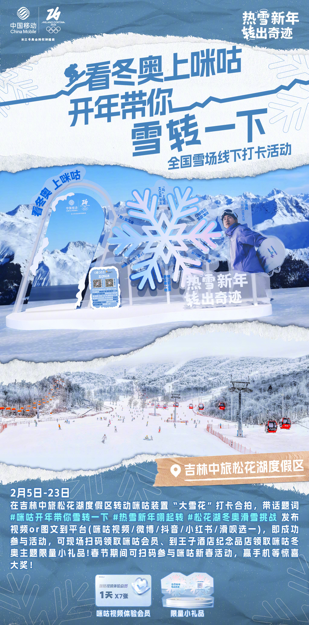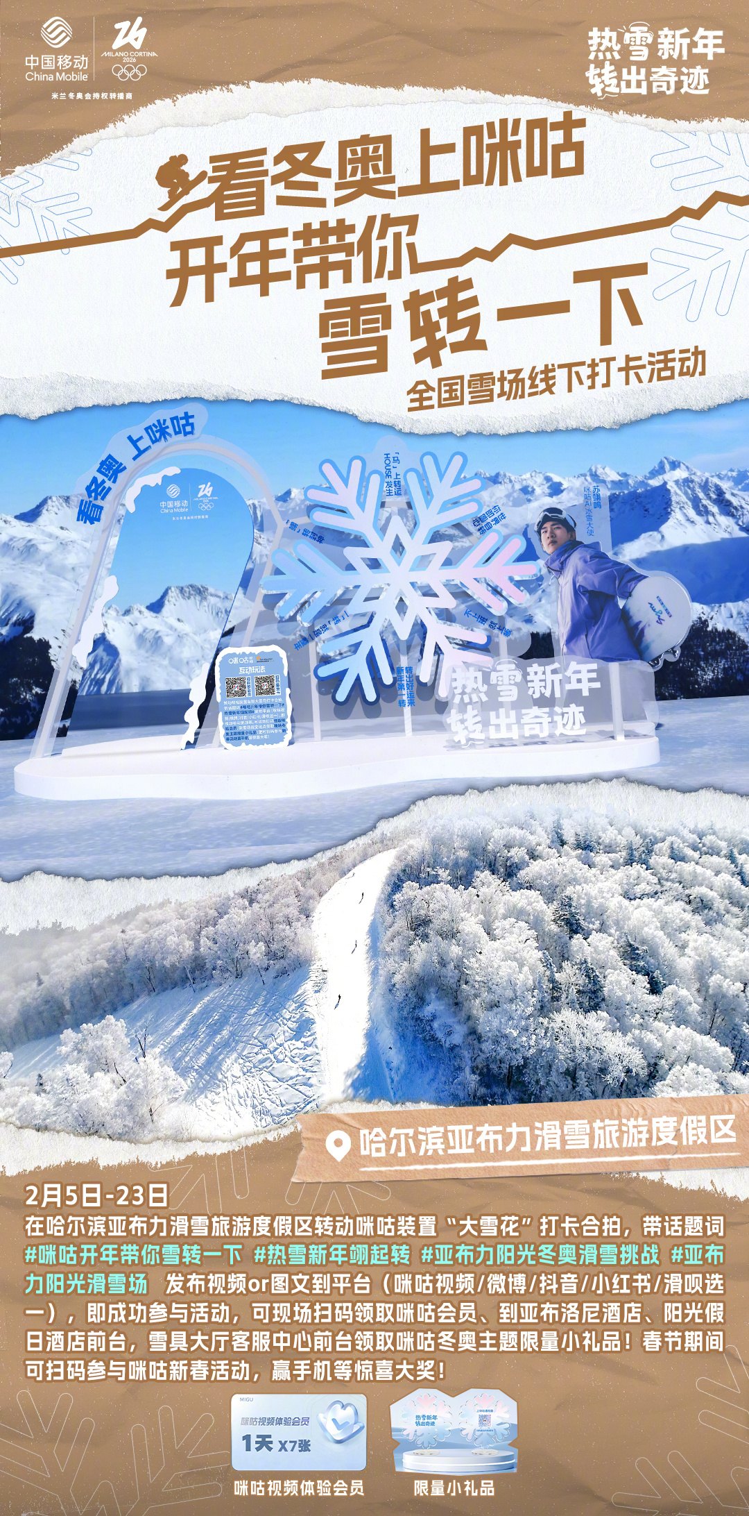#咪咕开年带你雪转一下# 热雪迎冬奥,好运转不停!咪咕冬奥雪场线下打卡活动今日开启!参与 #热雪新年翊起转# 挑战赛,一起“转”出好运来!⛷📍雪场打卡点:哈尔滨亚布力滑雪旅游度假区看赛事,玩打卡,多重乐趣转不停!❄