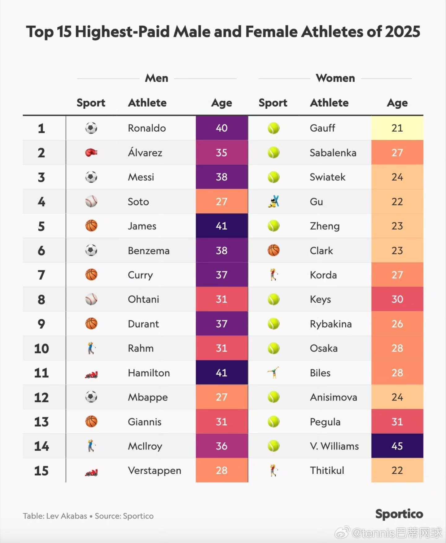 (3)男运动员赚的钱多得多。2025年收入最高的100名运动员中没有女性(相比于几年前,当时大阪直美🇯🇵和塞雷娜•威廉姆斯🇺🇸都进入了前100)