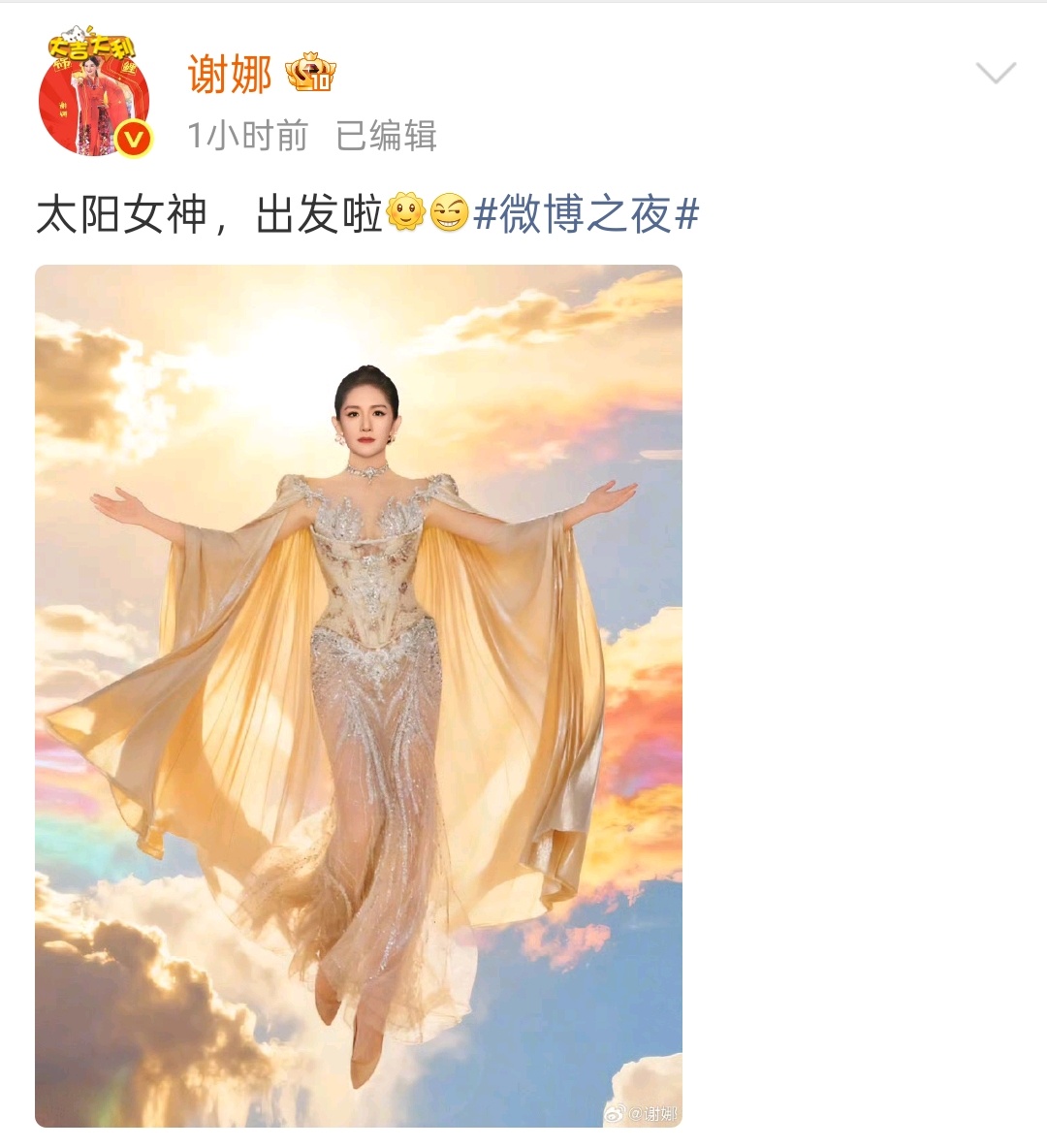 谢娜 太阳女神出发啦 哈哈哈谢娜微博之夜出发图真变太阳女神了,又美又搞笑,期待主