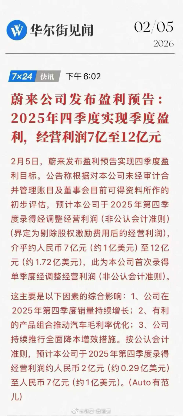 2月5日,也就是今天,蔚来公司发布盈利预告:2025年四季度预期实现经营利润7亿至12亿元。