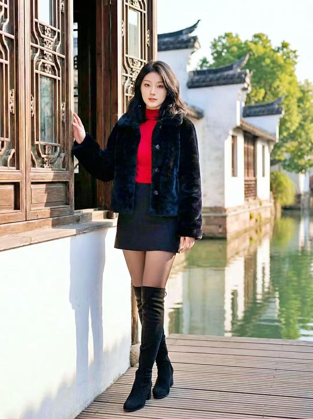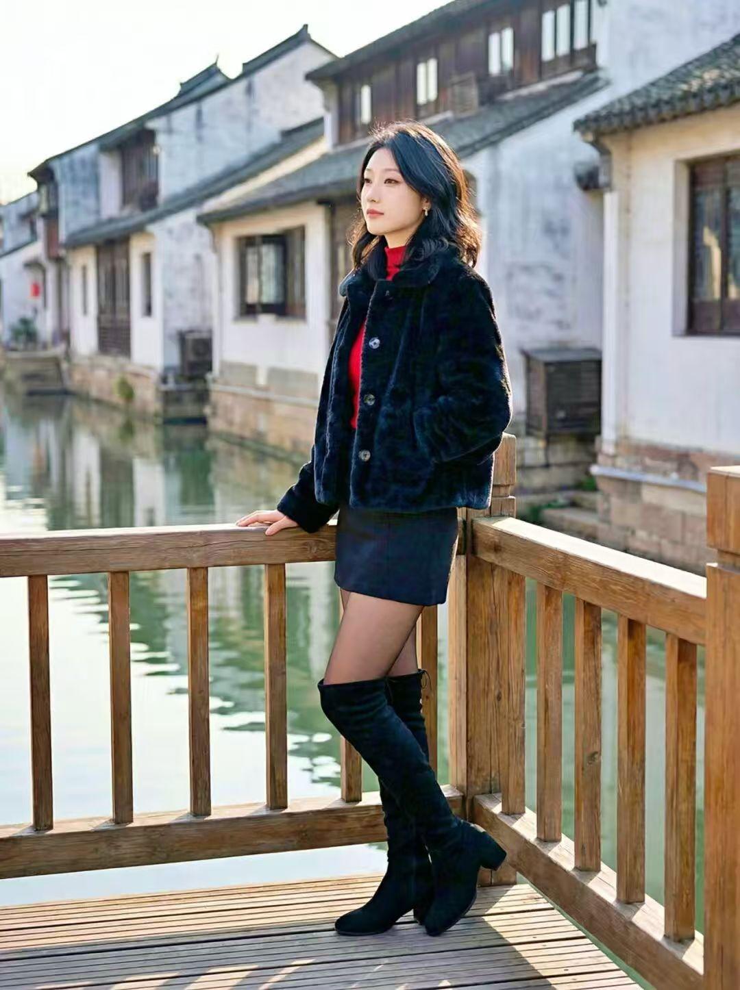 桥上美人倚栏杆 水边古韵映红妆