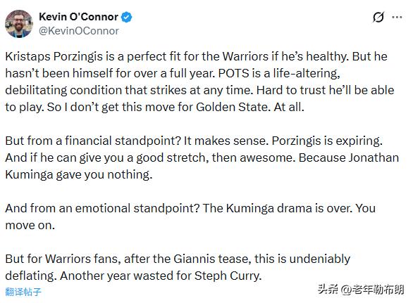 雅虎记者:勇士用字母吊足胃口换来铂金,库里又浪费了一年 2月5日,NBA曝出重磅交易:据知名美记Shams消息,金州勇士将乔纳森·库明加与巴迪·希尔德送至亚特兰大老鹰,换来克里斯塔普斯·波尔津吉斯。 雅虎记者Kevin OConnor随即发文点评,从三个维度拆解了这笔交易: 健康层面,他直言若波尔津吉斯能保持健康,便是勇士的完美拼图;但他已超一年未恢复至巅峰状态,POTS(体位性心动过速综合征)是一种会彻底改变人生、让人身心俱疲的疾病,且随时可能复发,因此他很难相信波尔津吉斯还能稳定上场,也完全无法理解勇士引进他的操作。 经济层面,这笔交易则十分合理:波尔津吉斯的合同即将到期,若他能为球队效力一段时间,无疑是加分项;反观库明加,此次交易中勇士几乎没从他身上获得任何实质回报。 情感层面,库明加的交易事件已成定局,球队理应向前看;但勇士球迷却倍感沮丧——在扬尼斯·阿德托昆博(字母哥)的转会传闻吊足胃口后,这笔交易无疑让人失望,斯蒂芬·库里又白白浪费了一年的巅峰时光。