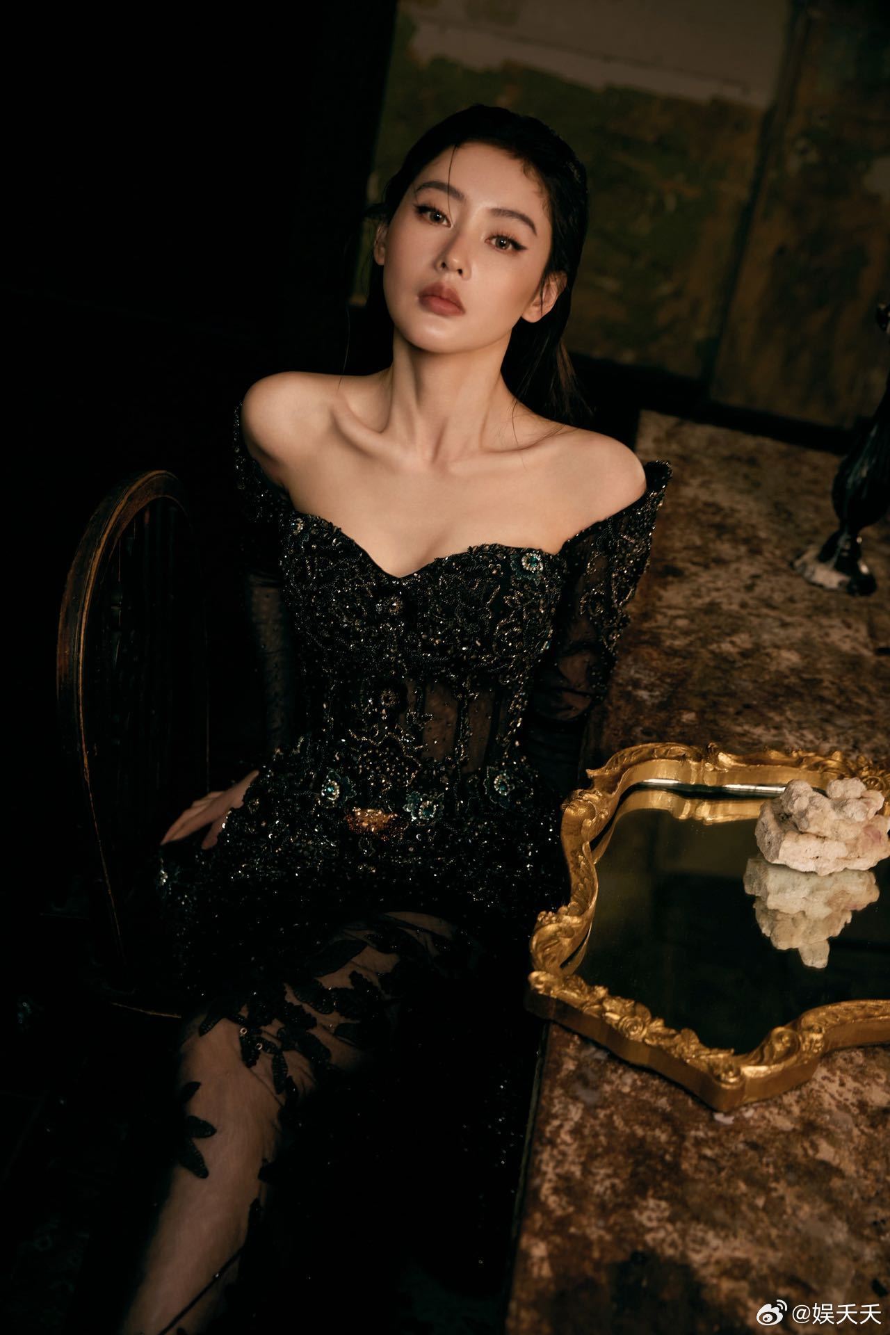 张天爱红唇黑裙造型女王来的 张天爱的造型太绝啦!一袭黑裙,闪钻在光影里流转,尽显
