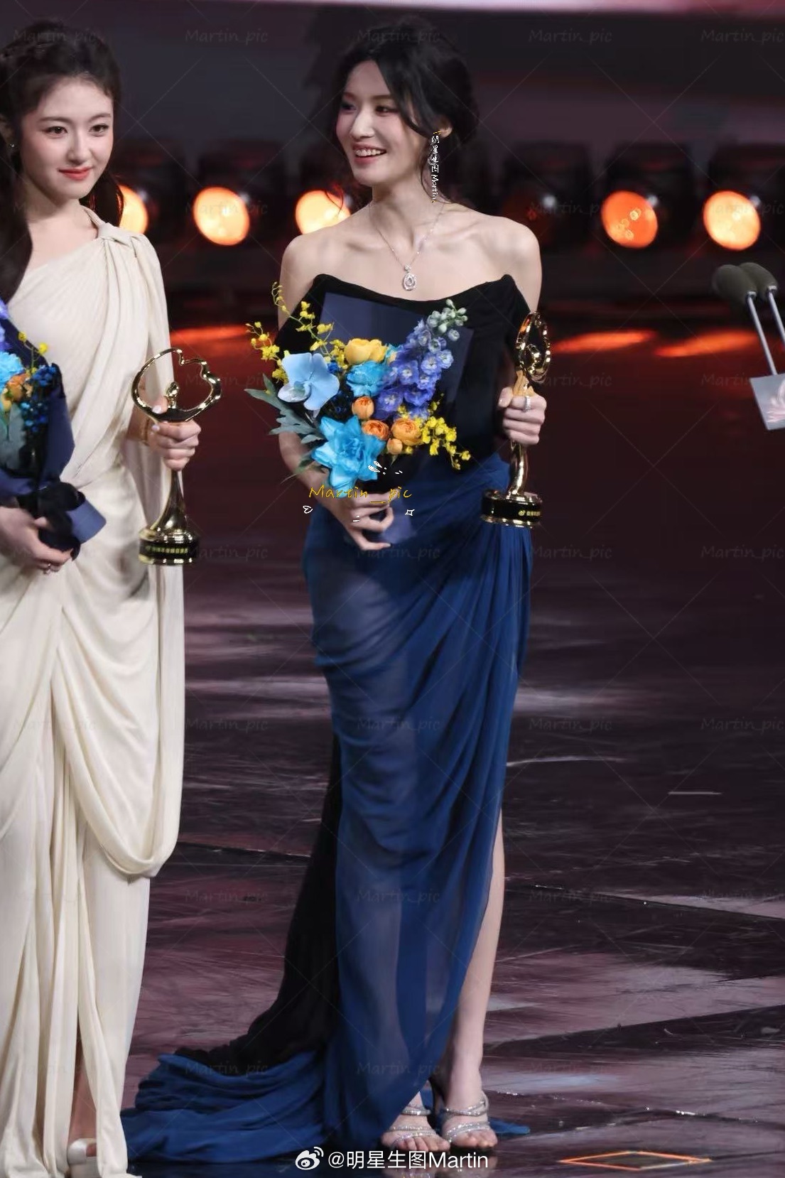 卢昱晓 卢昱晓微博之夜内场生图蓝色薄纱裙,噜噜晓今天好女神~李兰迪卢昱晓互相扶着