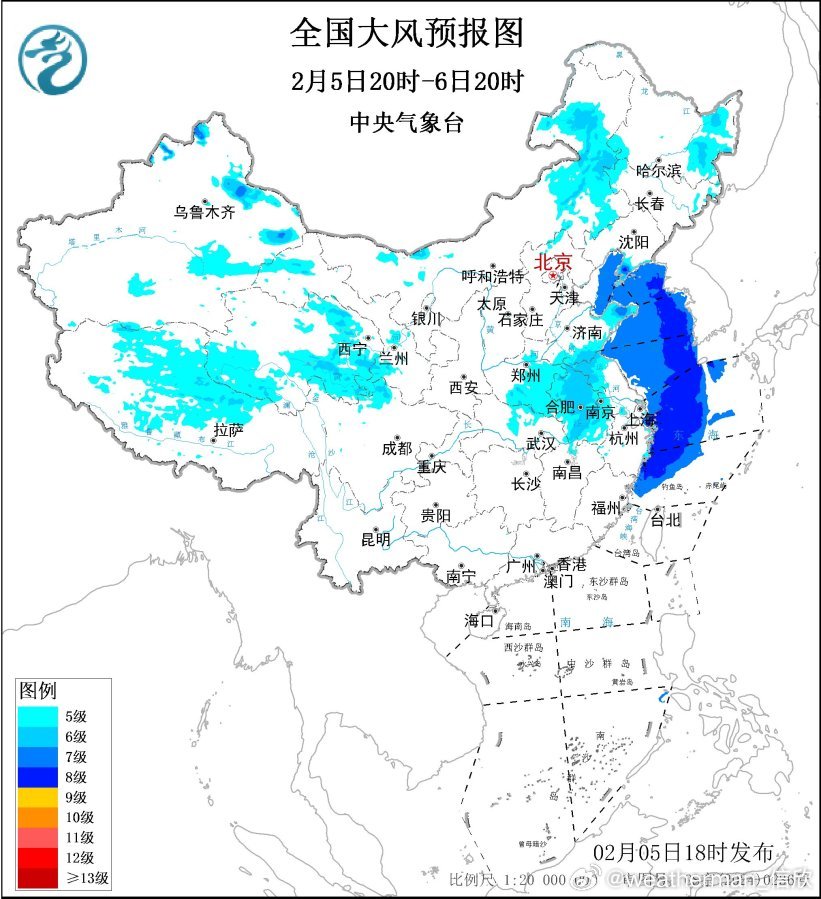 今晚中央气象台继续发布大风蓝色预警,预计,2月5日20时至6日20时,新疆北疆、青海东部和南部、西藏中北部、内蒙古东部、黑龙江东部、辽东半岛、山东半岛、河南东部、江苏西北部和东部沿海、安徽大部等地部分地区有5~6级风,阵风7~8级。渤海东部海域、渤海海峡、黄海大部海域、东海大部海域将有7~8级、阵风9级的大风。