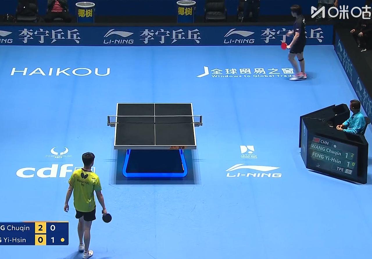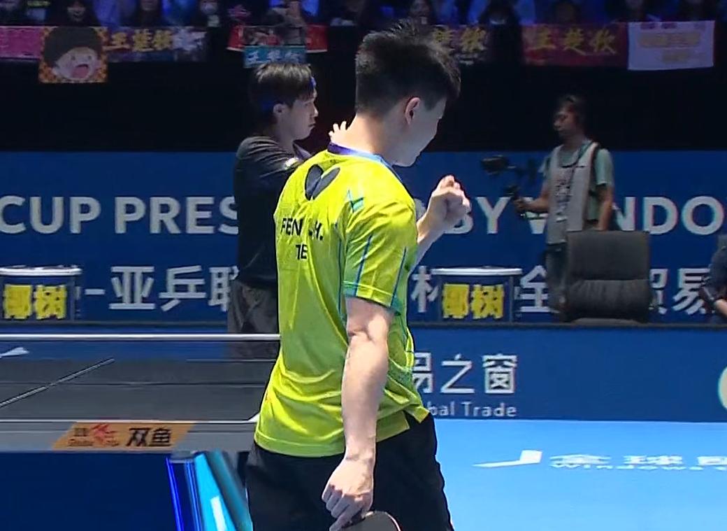 冯翊新大角度拉球, 没想到把王楚钦打热手了,哈哈 冯翊新惨了! 第一局 王楚钦11:7拿下。 第二局 王楚钦打落点, 11;4拿下, 第三局 冯翊新开始搏杀, 打了一个大角度球, 这下好了, 把王楚钦热身完毕了。 大头立马给他一个爆冲。 此时一个转折点, 那就是现场球迷喊加油, 被裁判警告了。 此后王楚钦连续失误, 冯翊新11;9拿下。