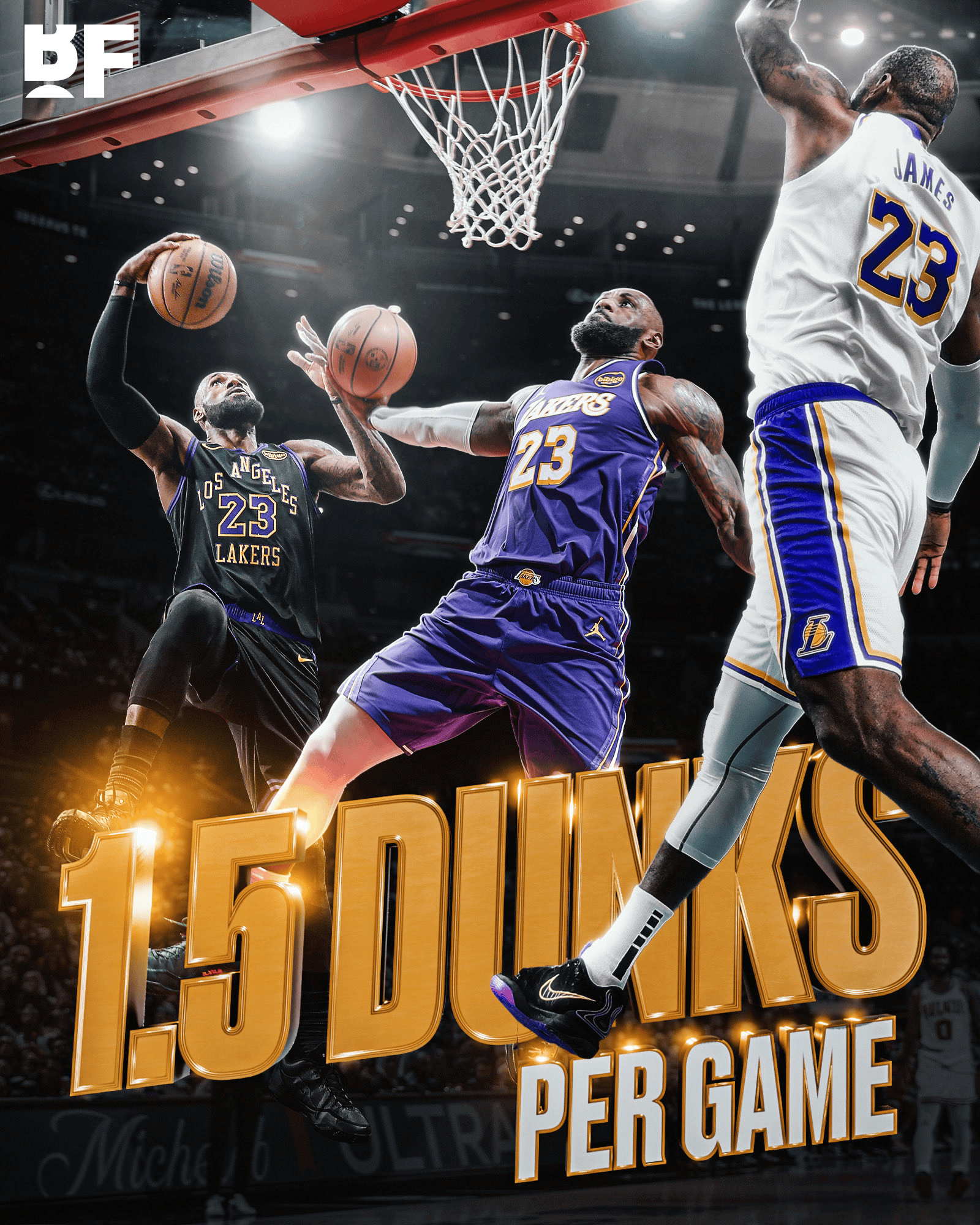 虎扑02月05日讯美媒BasketballForever分享数据:勒布朗-詹姆斯本赛季场均1.5次扣篮,创造近四个赛季最高。