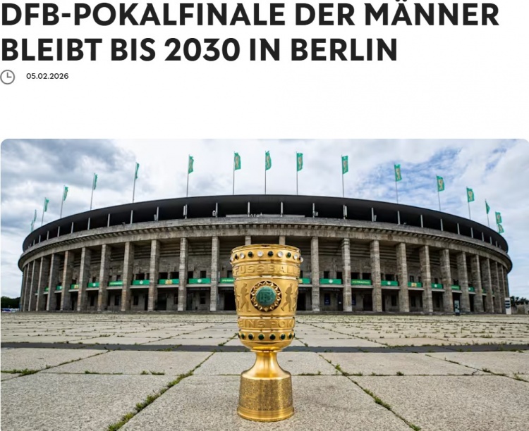 德国足协与柏林州已就延长男子德国杯决赛在柏林奥林匹克体育场的举办事宜达成一致,这项历史悠久的决赛将在未来五年继续于德国首都柏林举行。
